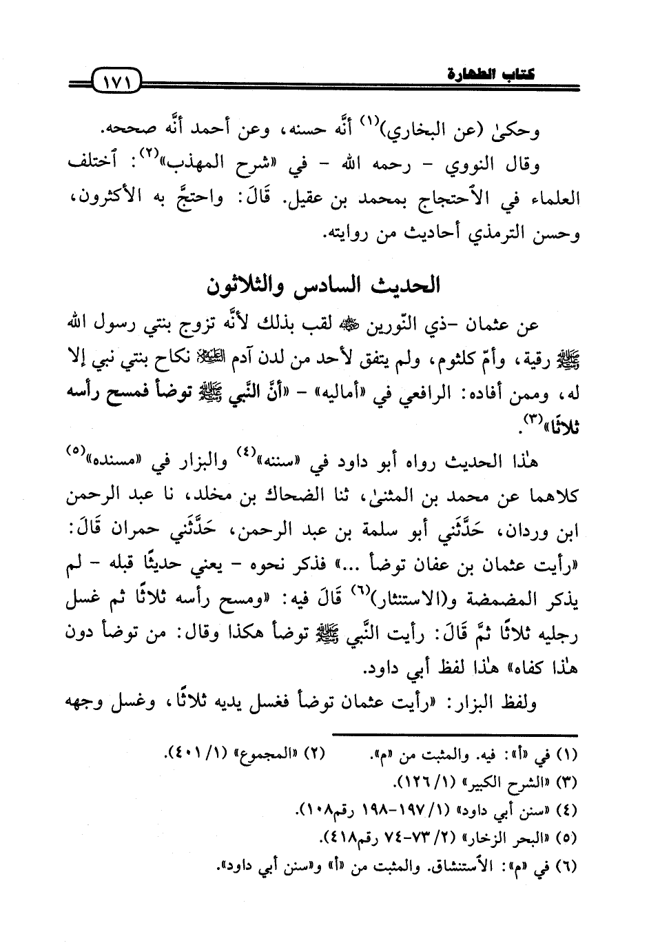 عَن عُثْمَان - ذِي النّورين رَضي اللهُ عَنهُ لقب بذلك لأنَّه تزوج بِنْتي رَسُول الله - صَلَّى الله عَلَيْهِ وَسلم - رقية، وأمّ كُلْثُوم، وَلم يتَّفق لأحد من لدن آدم عَلَيْهِ السَّلَام نِكَاح بِنْتي نَبِي إِلَّا لَهُ، وَمِمَّنْ أَفَادَهُ: الرَّافِعِيّ فِي «أَمَالِيهِ» - «أنَّ النَّبِي - صَلَّى الله عَلَيْهِ وَسلم - تَوَضَّأ فَمسح رَأسه ثَلَاثًا» .