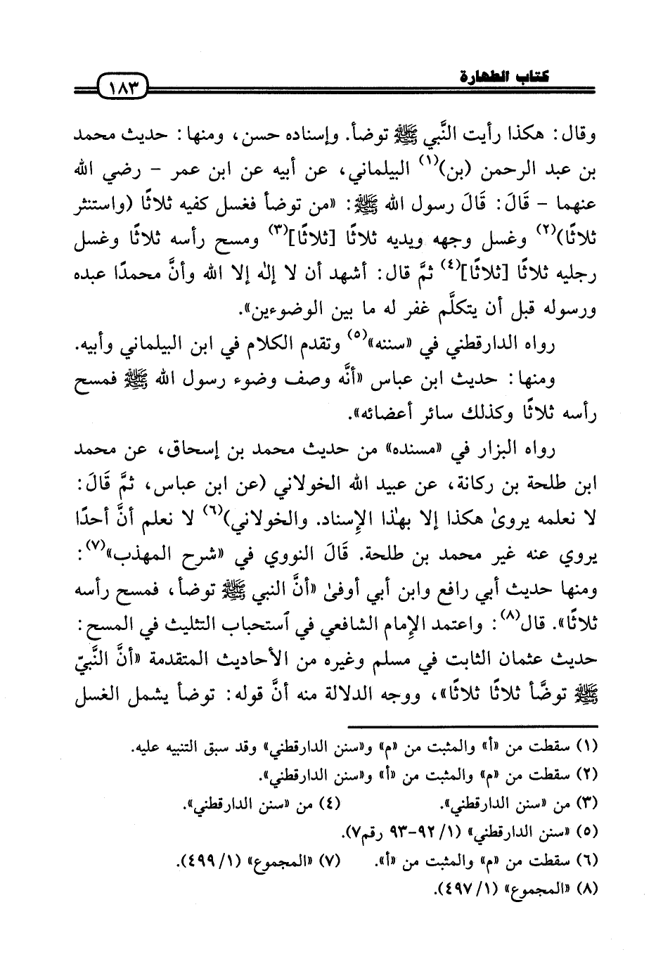 رَوَاهُ الْبَزَّار فِي «مُسْنده» من حَدِيث مُحَمَّد بن إِسْحَاق، عَن مُحَمَّد بن طَلْحَة بن ركَانَة، عَن عبيد الله الْخَولَانِيّ (عَن ابْن عَبَّاس، ثمَّ قَالَ: لَا نعلمهُ يرْوَى هَكَذَا إِلَّا بِهَذَا الإِسناد. والخولاني) لَا نعلم أنَّ أحدا يروي عَنهُ غير مُحَمَّد بن طَلْحَة. قَالَ النَّوَوِيّ فِي «شرح الْمُهَذّب» : وَمِنْهَا حَدِيث أبي رَافع وَابْن أبي أَوْفَى «أنَّ النَّبِي - صَلَّى الله عَلَيْهِ وَسلم - تَوَضَّأ، فَمسح رَأسه ثَلَاثًا» . قَالَ: وَاعْتمد الإِمام الشَّافِعِي فِي اسْتِحْبَاب التَّثْلِيث فِي الْمسْح: حَدِيث عُثْمَان الثَّابِت فِي مُسلم وَغَيره من الْأَحَادِيث الْمُتَقَدّمَة «أنَّ النَّبِي - صَلَّى الله عَلَيْهِ وَسلم - توضَّأ ثَلَاثًا ثَلَاثًا» ، وَوجه الدّلَالَة مِنْهُ أنَّ قَوْله: تَوَضَّأ يَشْمَل الْغسْل