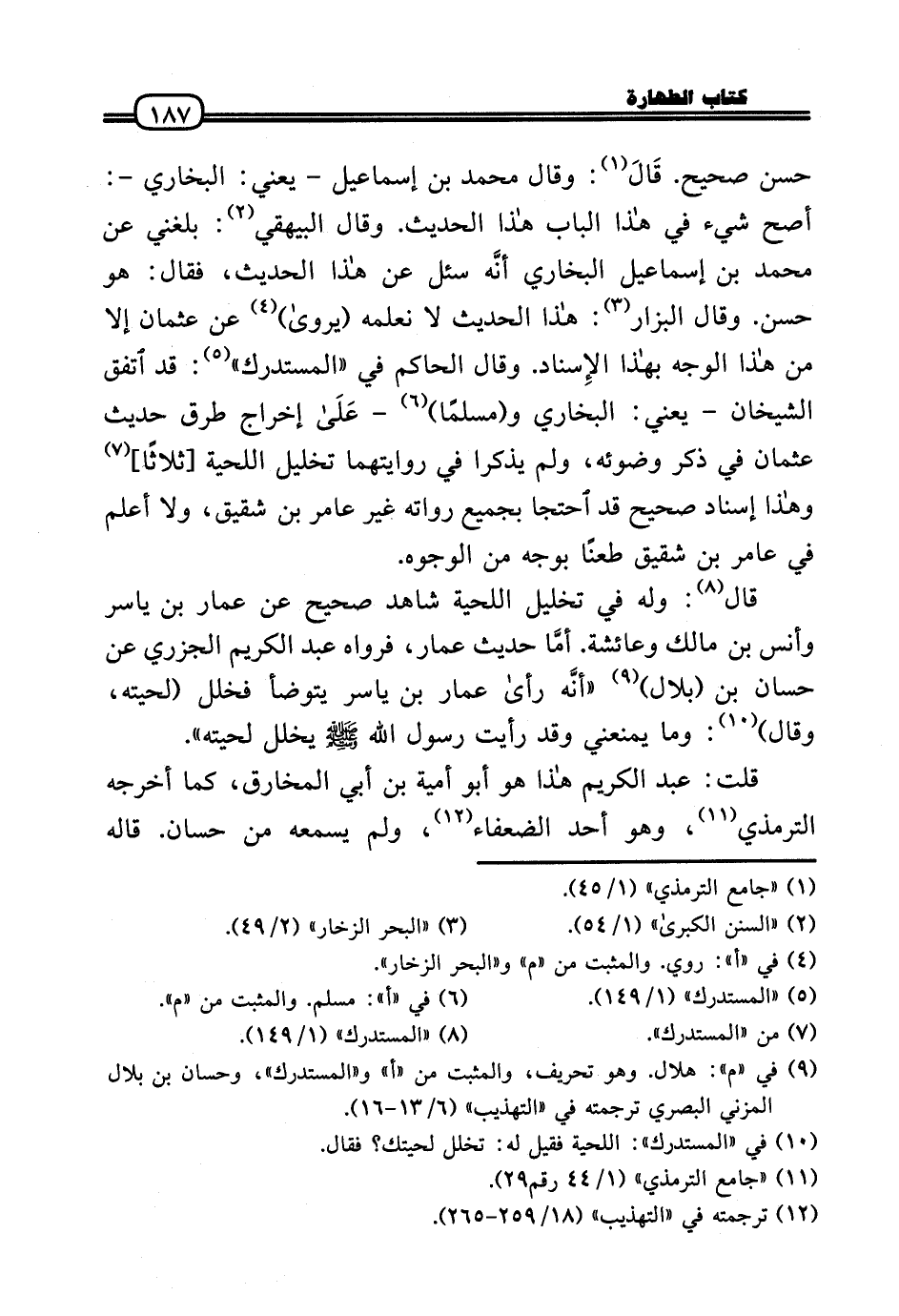 حسن صَحِيح. قَالَ: وَقَالَ مُحَمَّد بن إِسْمَاعِيل - يَعْنِي: البُخَارِيّ -: أصح شَيْء فِي هَذَا الْبَاب هَذَا الحَدِيث. وَقَالَ الْبَيْهَقِيّ: بَلغنِي عَن مُحَمَّد بن إِسْمَاعِيل البُخَارِيّ أنَّه سُئِلَ عَن هَذَا الحَدِيث، فَقَالَ: هُوَ حسن. وَقَالَ الْبَزَّار: هَذَا الحَدِيث لَا نعلمهُ (يرْوَى) عَن عُثْمَان إِلَّا من هَذَا الْوَجْه بِهَذَا الإِسناد. وَقَالَ الْحَاكِم فِي «الْمُسْتَدْرك» : قد اتّفق الشَّيْخَانِ - يَعْنِي: البُخَارِيّ و (مُسلما) - عَلَى إِخْرَاج طرق حَدِيث عُثْمَان فِي ذكر وضوئِهِ، وَلم يذكرَا فِي روايتهما تَخْلِيل اللِّحْيَة [ثَلَاثًا] وَهَذَا إِسْنَاد صَحِيح قد احتجا بِجَمِيعِ رُوَاته غير عَامر بن شَقِيق، وَلَا أعلم فِي عَامر بن شَقِيق طَعنا بِوَجْه من الْوُجُوه.