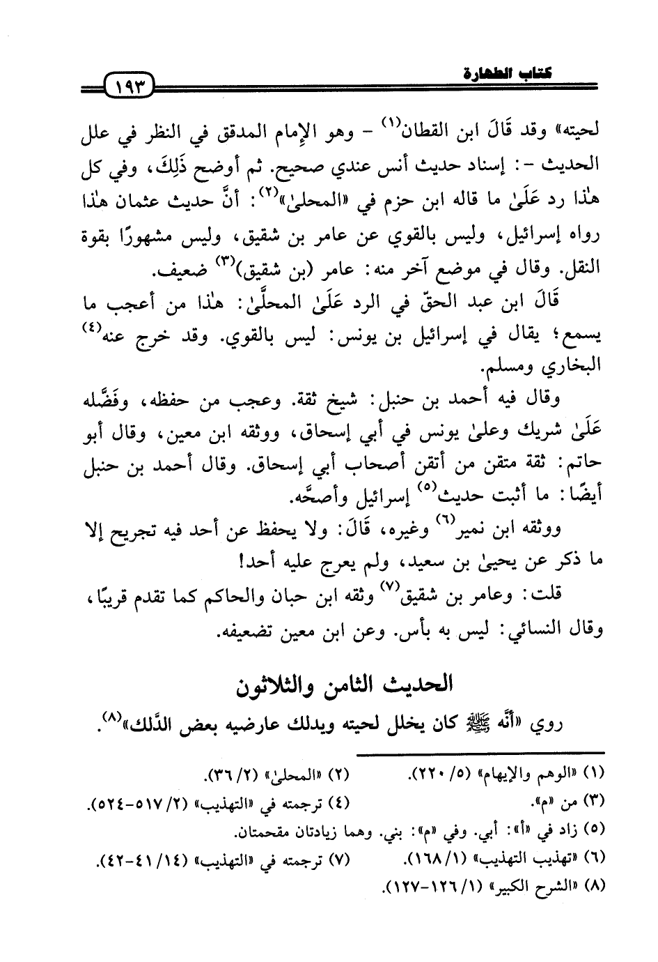 لحيته» وَقد قَالَ ابْن الْقطَّان - وَهُوَ الإِمام المدقق فِي النّظر فِي علل الحَدِيث -: إِسْنَاد حَدِيث أنس عِنْدِي صَحِيح. ثمَّ أوضح ذَلِكَ، وَفِي كل هَذَا رد عَلَى مَا قَالَه ابْن حزم فِي «الْمُحَلَّى» : أنَّ حَدِيث عُثْمَان هَذَا رَوَاهُ إِسْرَائِيل، وَلَيْسَ بِالْقَوِيّ عَن عَامر بن شَقِيق، وَلَيْسَ مَشْهُورا بِقُوَّة النَّقْل. وَقَالَ فِي مَوضِع آخر مِنْهُ: عَامر (بن شَقِيق) ضَعِيف.