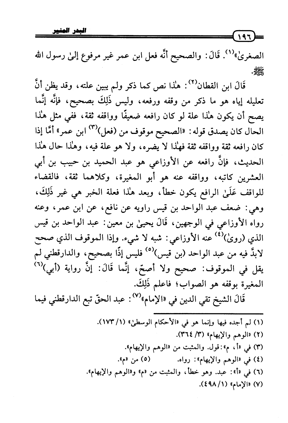 قَالَ ابْن الْقطَّان: هَذَا نَص كَمَا ذكر وَلم يبين علته، وَقد يظنّ أنَّ تَعْلِيله إِيَّاه هُوَ مَا ذكر من وَقفه وَرَفعه، وَلَيْسَ ذَلِكَ بِصَحِيح، فإنَّه إنَّما يَصح أَن يكون هَذَا عِلّة لَو كَانَ رافعه ضَعِيفا وواقفه ثِقَة، فَفِي مثل هَذَا الْحَال كَانَ يصدق قَوْله: «الصَّحِيح مَوْقُوف من (فعل) ابْن عمر» أمَّا إِذا كَانَ رافعه ثِقَة وواقفه ثِقَة فَهَذَا لَا يضرّهُ، وَلَا هُوَ عِلّة فِيهِ، وَهَذَا حَال هَذَا الحَدِيث، فإنَّ رافعه عَن الْأَوْزَاعِيّ هُوَ عبد الحميد بن حبيب بن أبي الْعشْرين كَاتبه، وواقفه عَنهُ هُوَ أَبُو الْمُغيرَة، وَكِلَاهُمَا ثِقَة، فالقضاء للْوَاقِف عَلَى الرافع يكون خطأ، وَبعد هَذَا فعلة الْخَبَر هِيَ غير ذَلِكَ، وَهِي: ضعف عبد الْوَاحِد بن قيس رَاوِيه عَن نَافِع، عَن ابْن عمر، وَعنهُ رَوَاهُ الْأَوْزَاعِيّ فِي الْوَجْهَيْنِ، قَالَ يَحْيَى بن معِين: عبد الْوَاحِد بن قيس الَّذِي (رَوَى) عَنهُ الْأَوْزَاعِيّ: شبه لَا شَيْء. وَإِذا الْمَوْقُوف الَّذِي صحّح لابدَّ فِيهِ من عبد الْوَاحِد (بن قيس) فَلَيْسَ إِذا بِصَحِيح، وَالدَّارَقُطْنِيّ لم يقل فِي الْمَوْقُوف: صَحِيح وَلَا أصحّ، إنَّما قَالَ: إنَّ رِوَايَة (أبي) الْمُغيرَة بوقفه هُوَ الصَّوَاب؛ فَاعْلَم ذَلِكَ.