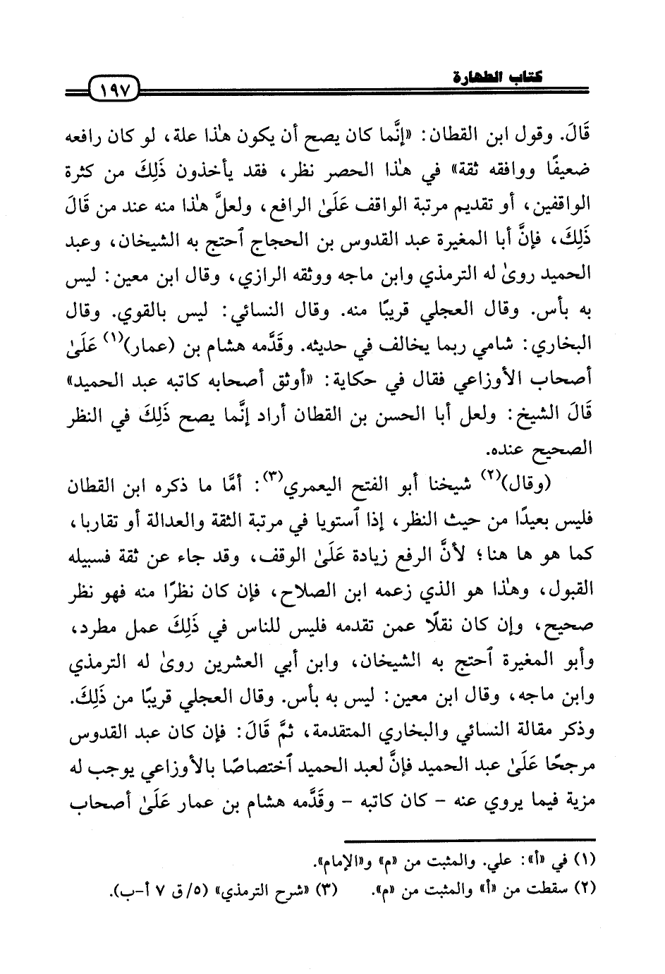 قَالَ. وَقَول ابْن الْقطَّان: «إنَّما كَانَ يَصح أَن يكون هَذَا عِلّة، لَو كَانَ رافعه ضَعِيفا وَوَافَقَهُ ثِقَة» فِي هَذَا الْحصْر نظر، فقد يَأْخُذُونَ ذَلِكَ من كَثْرَة الواقفين، أَو تَقْدِيم مرتبَة الْوَاقِف عَلَى الرافع، ولعلَّ هَذَا مِنْهُ عِنْد من قَالَ ذَلِكَ، فإنَّ أَبَا الْمُغيرَة عبد القدوس بن الْحجَّاج احْتج بِهِ الشَّيْخَانِ، وَعبد الحميد رَوَى لَهُ التِّرْمِذِيّ وَابْن مَاجَه وَوَثَّقَهُ الرَّازِيّ، وَقَالَ ابْن معِين: لَيْسَ بِهِ بَأْس. وَقَالَ الْعجلِيّ قَرِيبا مِنْهُ. وَقَالَ النَّسَائِيّ: لَيْسَ بِالْقَوِيّ. وَقَالَ البُخَارِيّ: شَامي رُبمَا يُخَالف فِي حَدِيثه. وقَدَّمه هِشَام بن (عمار) عَلَى أَصْحَاب الْأَوْزَاعِيّ فَقَالَ فِي حِكَايَة: «أوثق أَصْحَابه كَاتبه عبد الحميد» قَالَ الشَّيْخ: وَلَعَلَّ أَبَا الْحسن بن الْقطَّان أَرَادَ إنَّما يَصح ذَلِكَ فِي النّظر الصَّحِيح عِنْده.