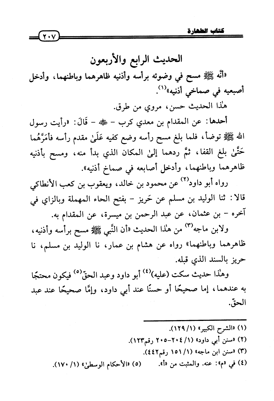 أَحدهَا: عَن الْمِقْدَام بن معدي كرب - رَضي اللهُ عَنهُ - قَالَ: «رَأَيْت رَسُول الله - صَلَّى الله عَلَيْهِ وَسلم - تَوَضَّأ، فَلَمَّا بلغ مسح رَأسه وضع كفيه عَلَى مقدم رَأسه فأمَرَّهُما حَتَّى بلغ الْقَفَا، ثمَّ ردهما إِلَى الْمَكَان الَّذِي بَدَأَ مِنْهُ، وَمسح بأذنيه ظاهرهما وباطنهما، وَأدْخل أَصَابِعه فِي صماخ أُذُنَيْهِ» .
