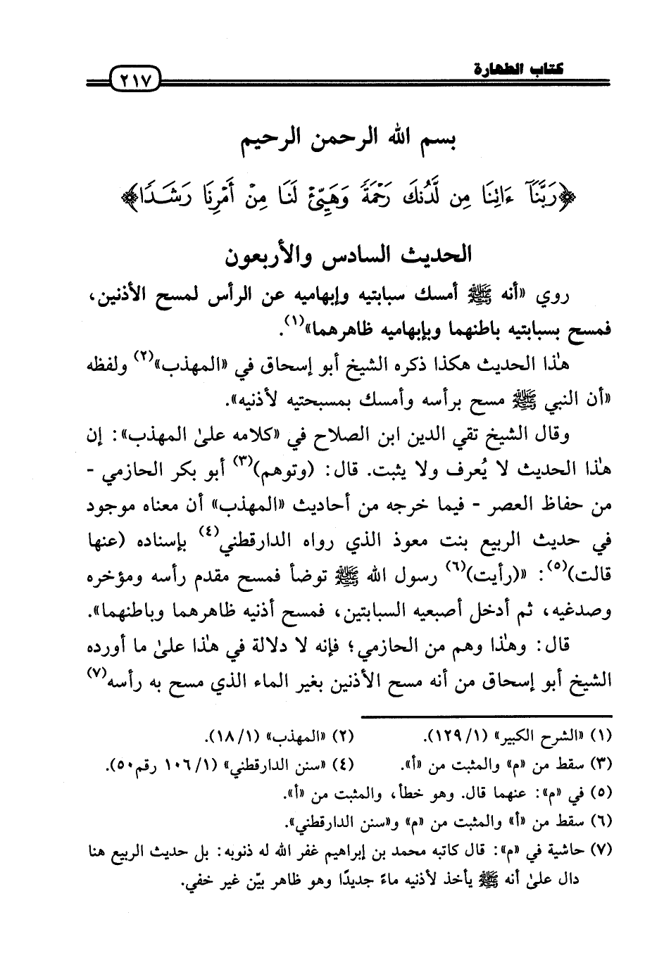 وَقَالَ الشَّيْخ تَقِيّ الدَّين ابْن الصّلاح فِي «كَلَامه عَلَى الْمُهَذّب» : إِن هَذَا الحَدِيث لَا يُعرف وَلَا يثبت. قَالَ: (وتوهم) أَبُو بكر الْحَازِمِي - من حفاظ الْعَصْر - فِيمَا خرجه من أَحَادِيث «الْمُهَذّب» أَن مَعْنَاهُ مَوْجُود فِي حَدِيث الرّبيع بنت معوذ الَّذِي رَوَاهُ الدَّارَقُطْنِيّ بِإِسْنَادِهِ (عَنْهَا قَالَت) : « (رَأَيْت) رَسُول الله - صَلَّى الله عَلَيْهِ وَسلم - تَوَضَّأ فَمسح مقدم رَأسه ومؤخره وصدغيه، ثمَّ أَدخل أصبعيه السبابتين، فَمسح أُذُنَيْهِ ظاهرهما وباطنهما» .