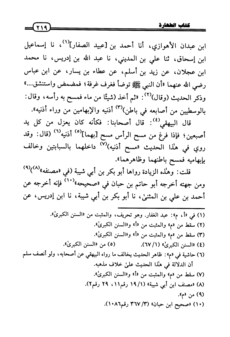 بن عَبْدَانِ الْأَهْوَازِي، أَنا أَحْمد بن [عبيد الصفار] ، نَا إِسْمَاعِيل بن إِسْحَاق، ثَنَا عَلّي بن الْمَدِينِيّ، نَا عبد الله بن إِدْرِيس، نَا مُحَمَّد بن عجلَان، عَن زيد بن أسلم، عَن عَطاء بن يسَار، عَن ابْن عَبَّاس رَضي اللهُ عَنهما «أَن النَّبِي - صَلَّى الله عَلَيْهِ وَسلم - تَوَضَّأ فغرف غرفَة؛ فَمَضْمض واستنشق ... » وَذكر الحَدِيث (وَقَالَ) : «ثمَّ أَخذ (شَيْئا من مَاء فَمسح بِهِ رَأسه، وَقَالَ: بالوسطيين من أَصَابِعه فِي بَاطِن) أُذُنَيْهِ والإبهامين من وَرَاء أُذُنَيْهِ» .