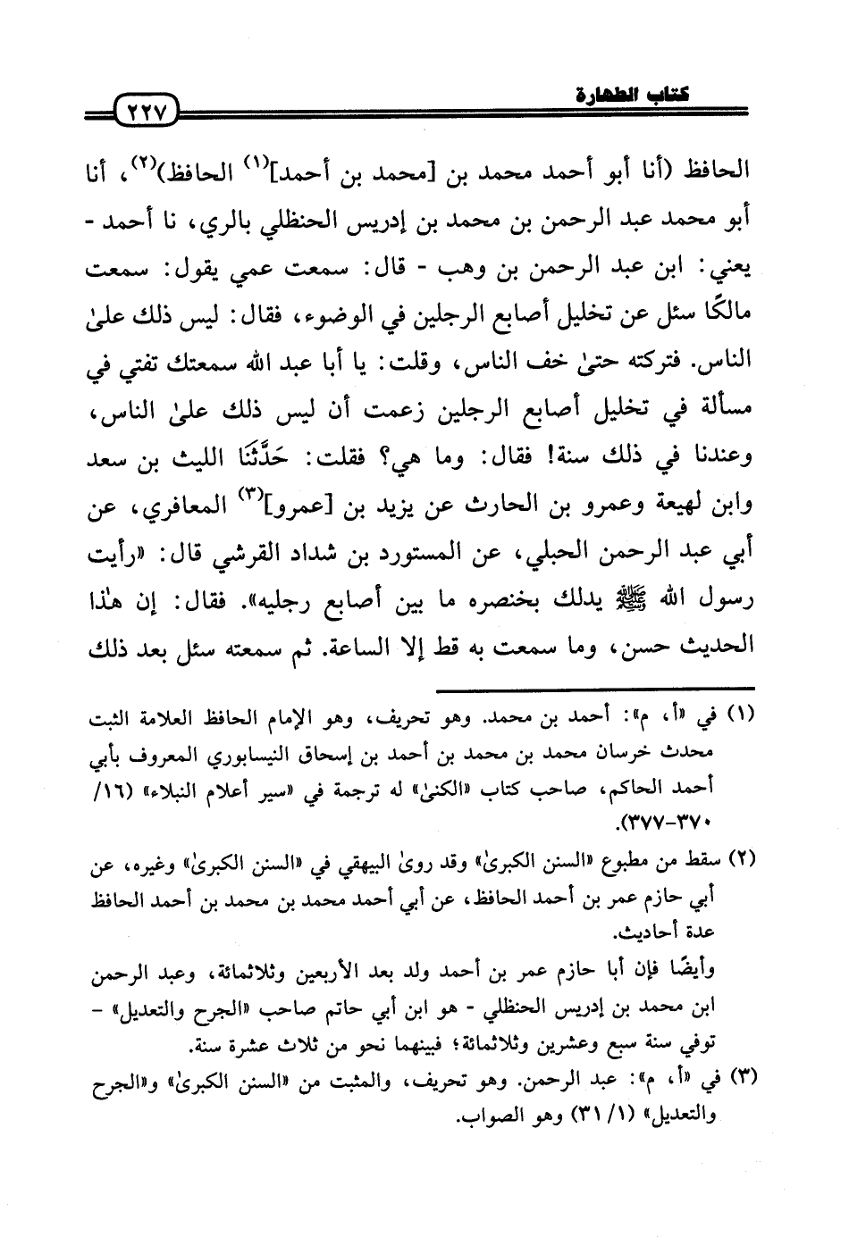 الْحَافِظ (أَنا أَبُو أَحْمد مُحَمَّد بن [مُحَمَّد بن أَحْمد] الْحَافِظ) ، أَنا أَبُو مُحَمَّد عبد الرَّحْمَن بن مُحَمَّد بن إِدْرِيس الْحَنْظَلِي بِالريِّ، نَا أَحْمد - يَعْنِي: ابْن عبد الرَّحْمَن بن وهب - قَالَ: سَمِعت عمي يَقُول: سَمِعت مَالِكًا سُئِلَ عَن تَخْلِيل أَصَابِع الرجلَيْن فِي الْوضُوء، فَقَالَ: لَيْسَ ذَلِك عَلَى النَّاس. فتركته حَتَّى خف النَّاس، وَقلت: يَا أَبَا عبد الله سَمِعتك تُفْتِي فِي مَسْأَلَة فِي تَخْلِيل أَصَابِع الرجلَيْن زعمت أَن لَيْسَ ذَلِك عَلَى النَّاس، وَعِنْدنَا فِي ذَلِك سنة! فَقَالَ: وَمَا هِيَ؟ فَقلت: حَدَّثَنَا اللَّيْث بن سعد وَابْن لَهِيعَة وَعَمْرو بن الْحَارِث عَن يزِيد بن [عَمْرو] الْمعَافِرِي، عَن أبي عبد الرَّحْمَن الحبلي، عَن الْمُسْتَوْرد بن شَدَّاد الْقرشِي قَالَ: «رَأَيْت رَسُول الله - صَلَّى الله عَلَيْهِ وَسلم - يدلك بِخِنْصرِهِ مَا بَين أَصَابِع رجلَيْهِ» . فَقَالَ: إِن هَذَا الحَدِيث حسن، وَمَا سَمِعت بِهِ قطّ إِلَّا السَّاعَة. ثمَّ سمعته سُئِلَ بعد ذَلِك