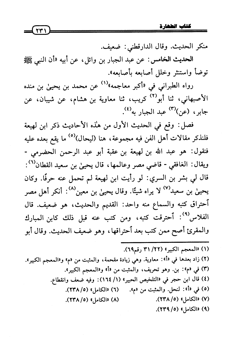 الحَدِيث الْخَامِس: عَن عبد الْجَبَّار بن وَائِل، عَن أَبِيه «أَن النَّبِي - صَلَّى الله عَلَيْهِ وَسلم - تَوَضَّأ واستنثر وخلل أَصَابِعه بأصابعه» .