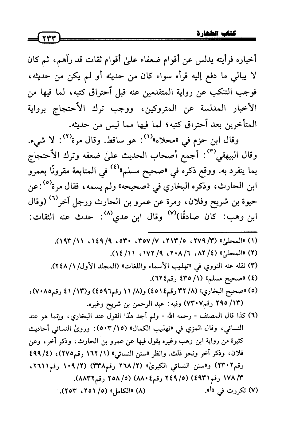 وَقَالَ ابْن حزم فِي «محلاه» : هُوَ سَاقِط. وَقَالَ مرّة: لَا شَيْء. وَقَالَ الْبَيْهَقِيّ: أجمع أَصْحَاب الحَدِيث عَلَى ضعفه وَترك الِاحْتِجَاج بِمَا ينْفَرد بِهِ. وَوَقع ذكره فِي «صَحِيح مُسلم» فِي الْمُتَابَعَة مَقْرُونا بِعَمْرو بن الْحَارِث، وَذكره البُخَارِيّ فِي «صَحِيحه» وَلم يسمه، فَقَالَ مرّة: عَن حَيْوَة بن شُرَيْح وَفُلَان، وَمرَّة عَن عَمْرو بن الْحَارِث وَرجل آخر (وَقَالَ ابْن وهب: كَانَ صَادِقا) وَقَالَ ابْن عدي: حدث عَنهُ الثِّقَات: