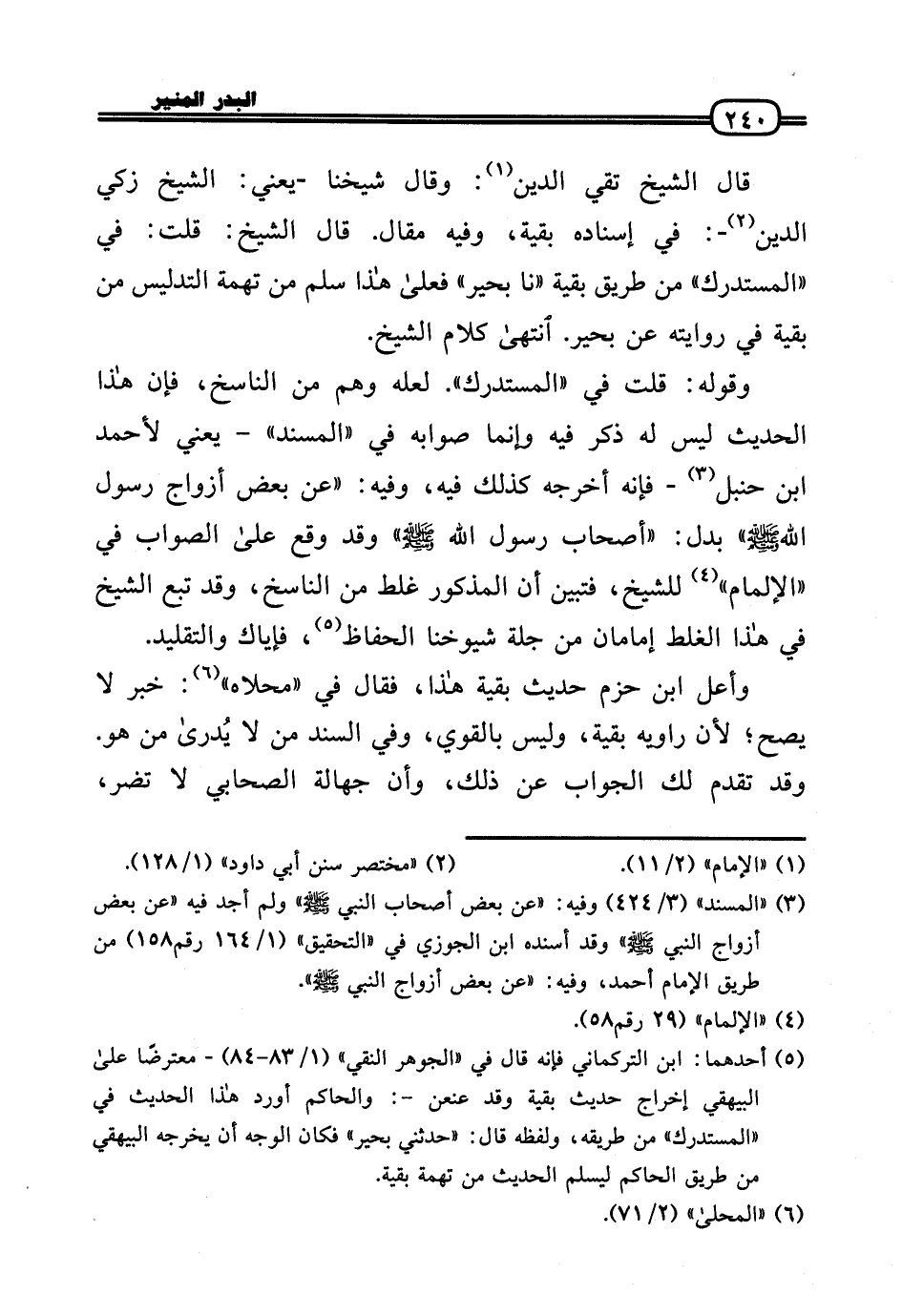 قَالَ الشَّيْخ تَقِيّ الدَّين: وَقَالَ شَيخنَا - يَعْنِي: الشَّيْخ زكي الدَّين -: فِي إِسْنَاده بَقِيَّة، وَفِيه مقَال. قَالَ الشَّيْخ: قلت: فِي «الْمُسْتَدْرك» من طَرِيق بَقِيَّة «نَا بحير» فعلَى هَذَا سلم من تُهْمَة التَّدْلِيس من بَقِيَّة فِي رِوَايَته عَن بحير. انْتَهَى كَلَام الشَّيْخ.