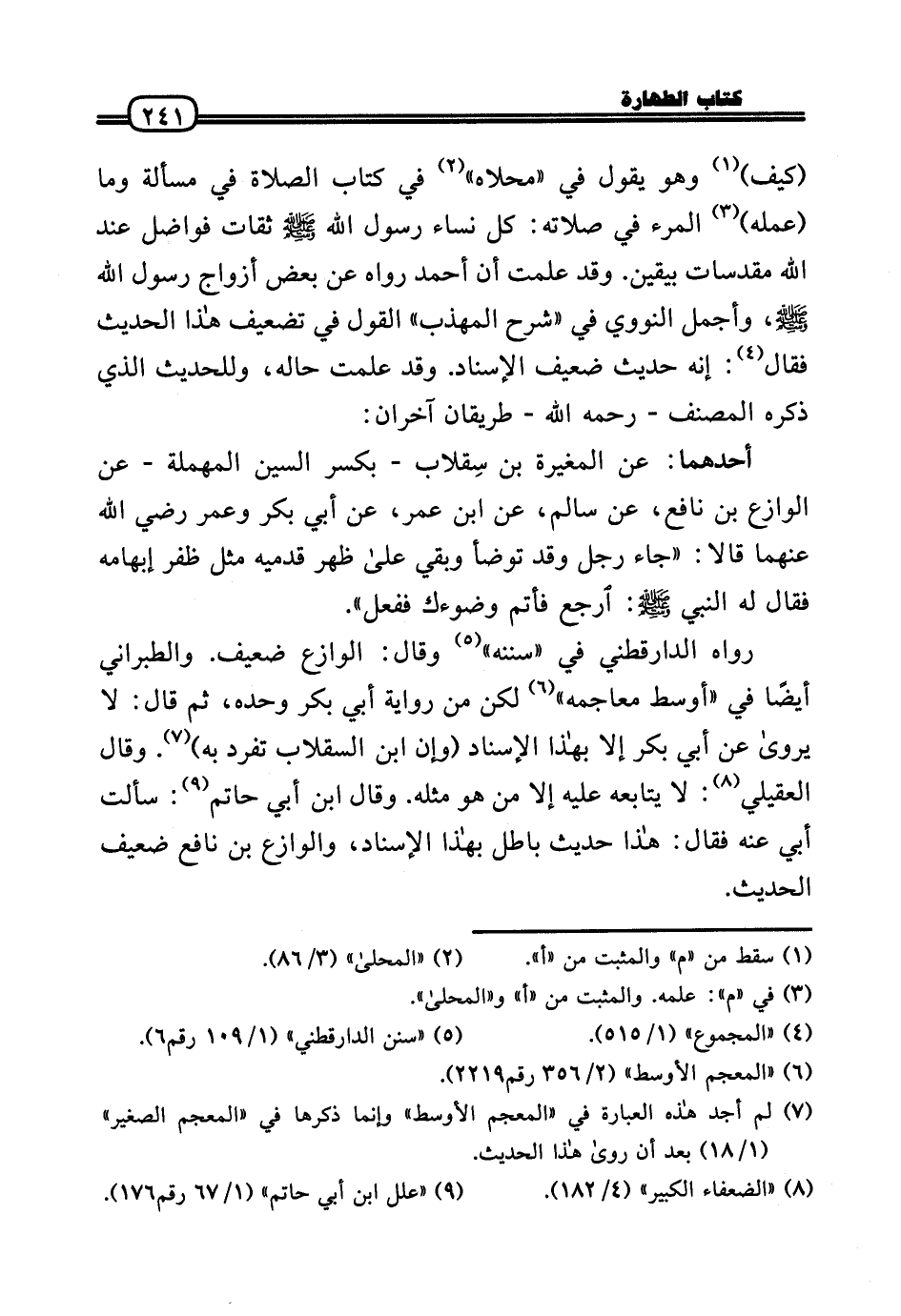 (كَيفَ) وَهُوَ يَقُول فِي «محلاه» فِي كتاب الصَّلَاة فِي مَسْأَلَة وَمَا (عمله) الْمَرْء فِي صلَاته: كل نسَاء رَسُول الله - صَلَّى الله عَلَيْهِ وَسلم - ثِقَات فواضل عِنْد الله مقدسات بِيَقِين. وَقد علمت أَن أَحْمد رَوَاهُ عَن بعض أَزوَاج رَسُول الله - صَلَّى الله عَلَيْهِ وَسلم -، وأجمل النَّوَوِيّ فِي «شرح الْمُهَذّب» القَوْل فِي تَضْعِيف هَذَا الحَدِيث فَقَالَ: إِنَّه حَدِيث ضَعِيف الْإِسْنَاد. وَقد علمت حَاله، وَلِلْحَدِيثِ الَّذِي ذكره المُصَنّف - رَحِمَهُ اللَّهُ - طَرِيقَانِ آخرَانِ: