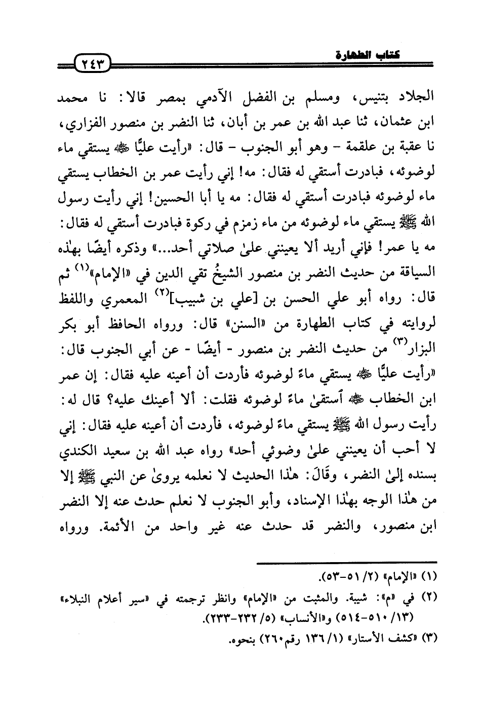 الجلاد بتنيس، وَمُسلم بن الْفضل الْآدَمِيّ بِمصْر قَالَا: نَا مُحَمَّد بن عُثْمَان، ثَنَا عبد الله بن عمر بن أبان، ثَنَا النَّضر بن مَنْصُور الْفَزارِيّ، نَا عقبَة بن عَلْقَمَة - وَهُوَ أَبُو الْجنُوب - قَالَ: «رَأَيْت عليًّا رَضي اللهُ عَنهُ يَسْتَقِي مَاء لوضوئه، فبادرت أستقي لَهُ فَقَالَ: مَه! إِنِّي رَأَيْت عمر بن الْخطاب يَسْتَقِي مَاء لوضوئه فبادرت أستقي لَهُ فَقَالَ: مَه يَا أَبَا الْحُسَيْن! إِنِّي رَأَيْت رَسُول الله - صَلَّى الله عَلَيْهِ وَسلم - يَسْتَقِي مَاء لوضوئه من مَاء زَمْزَم فِي ركوة فبادرت أستقي لَهُ فَقَالَ: مَه يَا عمر! فَإِنِّي أُرِيد أَلا يُعِيننِي عَلَى صَلَاتي أحد ... » وَذكره أَيْضا بِهَذِهِ السِّيَاقَة من حَدِيث النَّضر بن مَنْصُور الشيخُ تَقِيّ الدَّين فِي «الإِمَام» ثمَّ قَالَ: رَوَاهُ أَبُو عَلّي الْحسن بن [عَلّي بن شبيب] المعمري وَاللَّفْظ لروايته فِي كتاب الطَّهَارَة من «السّنَن» قَالَ: وَرَوَاهُ الْحَافِظ أَبُو بكر الْبَزَّار من حَدِيث النَّضر بن مَنْصُور - أَيْضا - عَن أبي الْجنُوب قَالَ: «رَأَيْت عليًّا رَضي اللهُ عَنهُ يَسْتَقِي مَاء لوضوئه فَأَرَدْت أَن أعينه عَلَيْهِ فَقَالَ: إِن عمر بن الْخطاب رَضي اللهُ عَنهُ استقى مَاء لوضوئه فَقلت: أَلا أعينك عَلَيْهِ؟ قَالَ لَهُ: رَأَيْت رَسُول الله - صَلَّى الله عَلَيْهِ وَسلم - يَسْتَقِي مَاء لوضوئه، فَأَرَدْت أَن أعينه عَلَيْهِ فَقَالَ: إِنِّي لَا أحب أَن يُعِيننِي عَلَى وضوئي أحد» رَوَاهُ عبد الله بن سعيد الْكِنْدِيّ بِسَنَدِهِ إِلَى النَّضر، وقَالَ: هَذَا الحَدِيث لَا نعلمهُ يرْوَى عَن النَّبِي - صَلَّى الله عَلَيْهِ وَسلم - إِلَّا من هَذَا الْوَجْه بِهَذَا الْإِسْنَاد، وَأَبُو الْجنُوب لَا نعلم حدث عَنهُ إِلَّا النَّضر بن مَنْصُور، وَالنضْر قد حدث عَنهُ غير وَاحِد من الْأَئِمَّة. وَرَوَاهُ