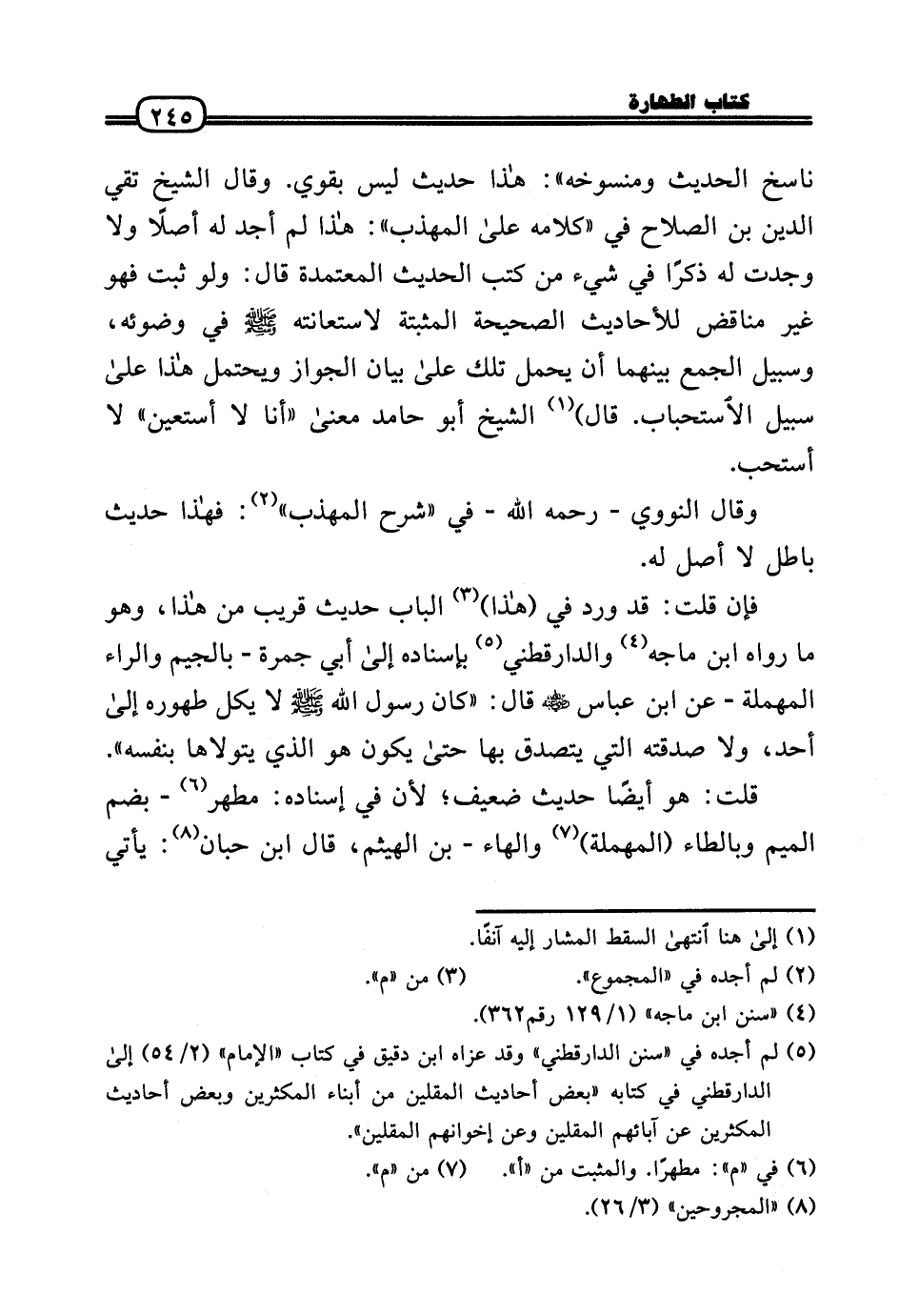 نَاسخ الحَدِيث ومنسوخه» : هَذَا حَدِيث لَيْسَ بِقَوي. وَقَالَ الشَّيْخ تَقِيّ الدَّين بن الصّلاح فِي «كَلَامه عَلَى الْمُهَذّب» : هَذَا لم أجد لَهُ أصلا وَلَا وجدت لَهُ ذكرا فِي شَيْء من كتب الحَدِيث الْمُعْتَمدَة قَالَ: وَلَو ثَبت فَهُوَ غير مُنَاقض للأحاديث الصَّحِيحَة المثبتة لاستعانته (فِي وضوئِهِ، وسبيل الْجمع بَينهمَا أَن يحمل تِلْكَ عَلَى بَيَان الْجَوَاز وَيحْتَمل هَذَا عَلَى سَبِيل الِاسْتِحْبَاب. قَالَ) الشَّيْخ أَبُو حَامِد مَعْنَى «أَنا لَا أستعين» لَا أستحب.