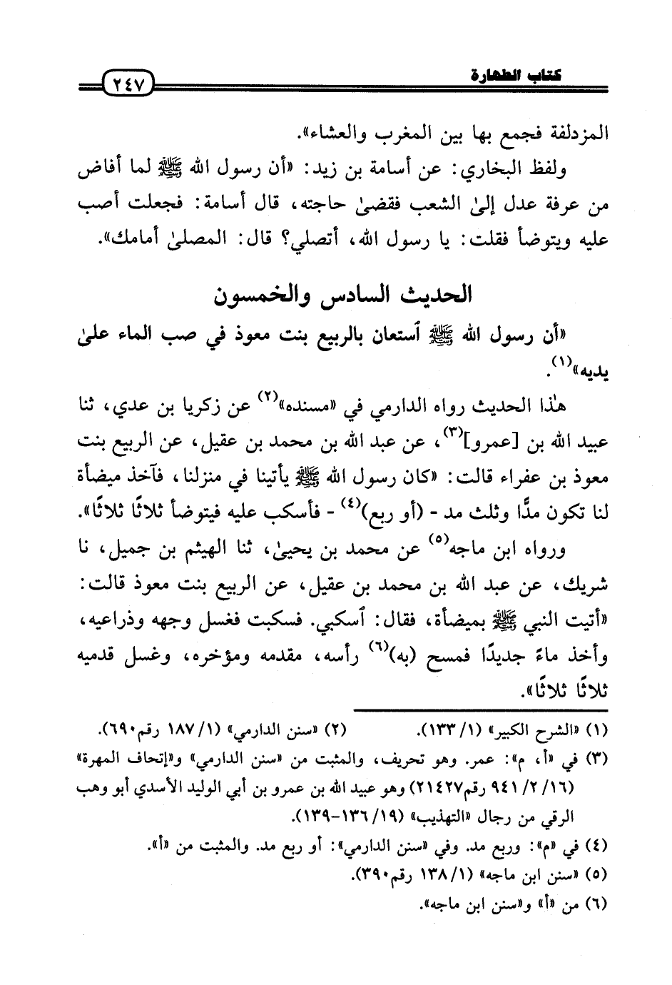 هَذَا الحَدِيث رَوَاهُ الدَّارمِيّ فِي «مُسْنده» عَن زَكَرِيَّا بن عدي، ثَنَا عبيد الله بن [عَمْرو] ، عَن عبد الله بن مُحَمَّد بن عقيل، عَن الرّبيع بنت معوذ بن عفراء قَالَت: «كَانَ رَسُول الله - صَلَّى الله عَلَيْهِ وَسلم - يأتينا فِي منزلنا، فآخذ ميضأة لنا تكون مدًّا وَثلث مد - (أَو ربع) - فأسكب عَلَيْهِ فيتوضأ ثَلَاثًا ثَلَاثًا» .
