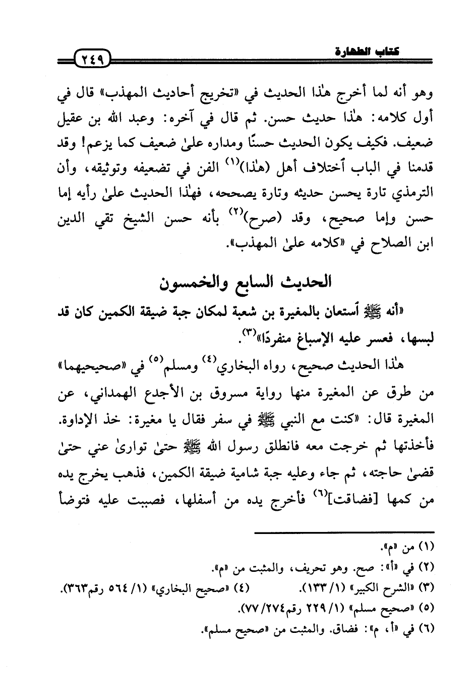 هَذَا الحَدِيث صَحِيح، رَوَاهُ البُخَارِيّ وَمُسلم فِي «صَحِيحَيْهِمَا» من طرق عَن الْمُغيرَة مِنْهَا رِوَايَة مَسْرُوق بن الأجدع الْهَمدَانِي، عَن الْمُغيرَة قَالَ: «كنت مَعَ النَّبِي - صَلَّى الله عَلَيْهِ وَسلم - فِي سفر فَقَالَ يَا مُغيرَة: خُذ الْإِدَاوَة. فأخذتها ثمَّ خرجت مَعَه فَانْطَلق رَسُول الله - صَلَّى الله عَلَيْهِ وَسلم - حَتَّى توارى عني حَتَّى قَضَى حَاجته، ثمَّ جَاءَ وَعَلِيهِ جُبَّة شامية ضيقَة الكمين، فَذهب يخرج يَده من كمها [فضاقت] فَأخْرج يَده من أَسْفَلهَا، فَصَبَبْت عَلَيْهِ فَتَوَضَّأ