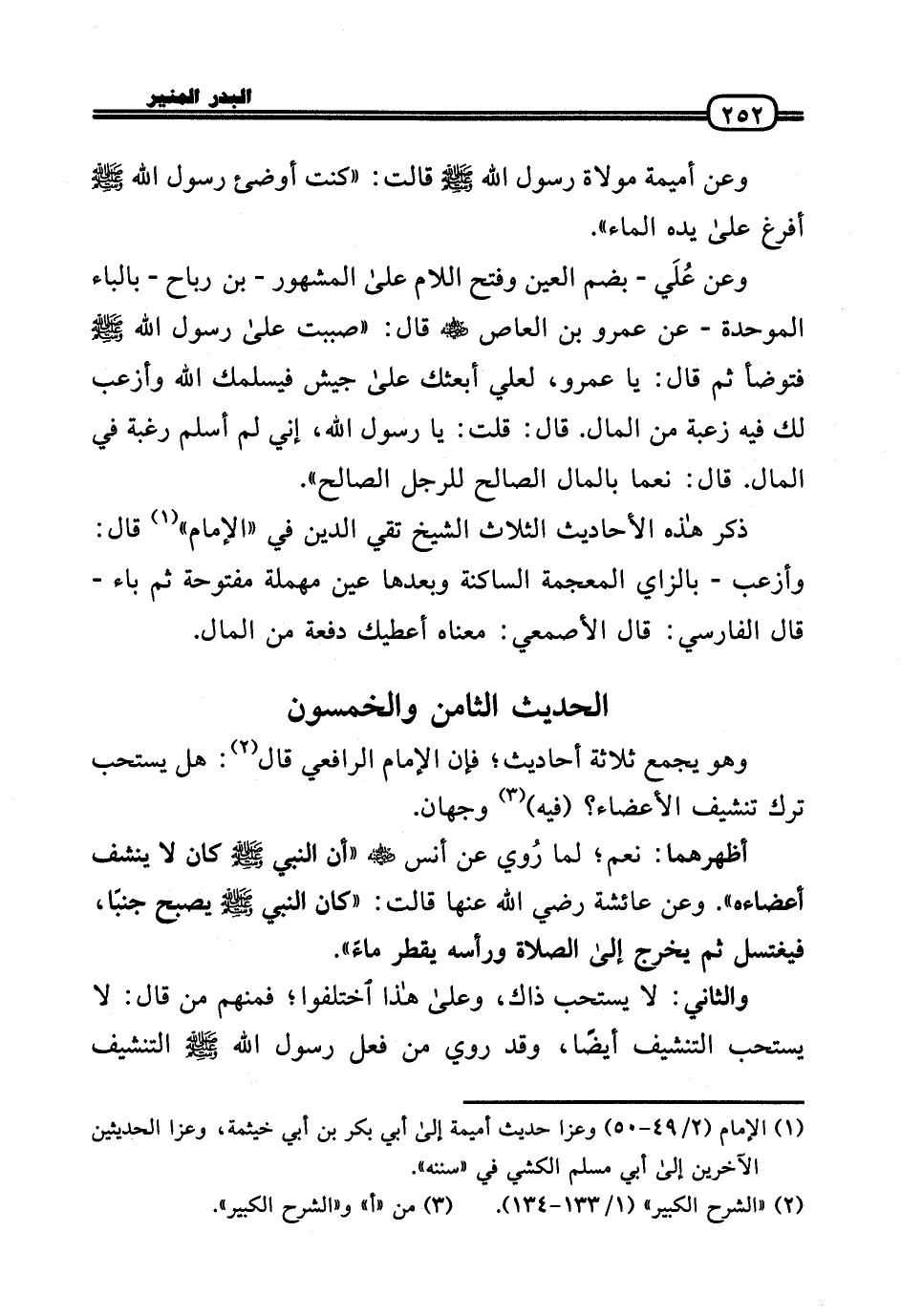 وَهُوَ يجمع ثَلَاثَة أَحَادِيث؛ فَإِن الإِمَام الرَّافِعِيّ قَالَ: هَل يسْتَحبّ ترك تنشيف الْأَعْضَاء؟ (فِيهِ) وَجْهَان.