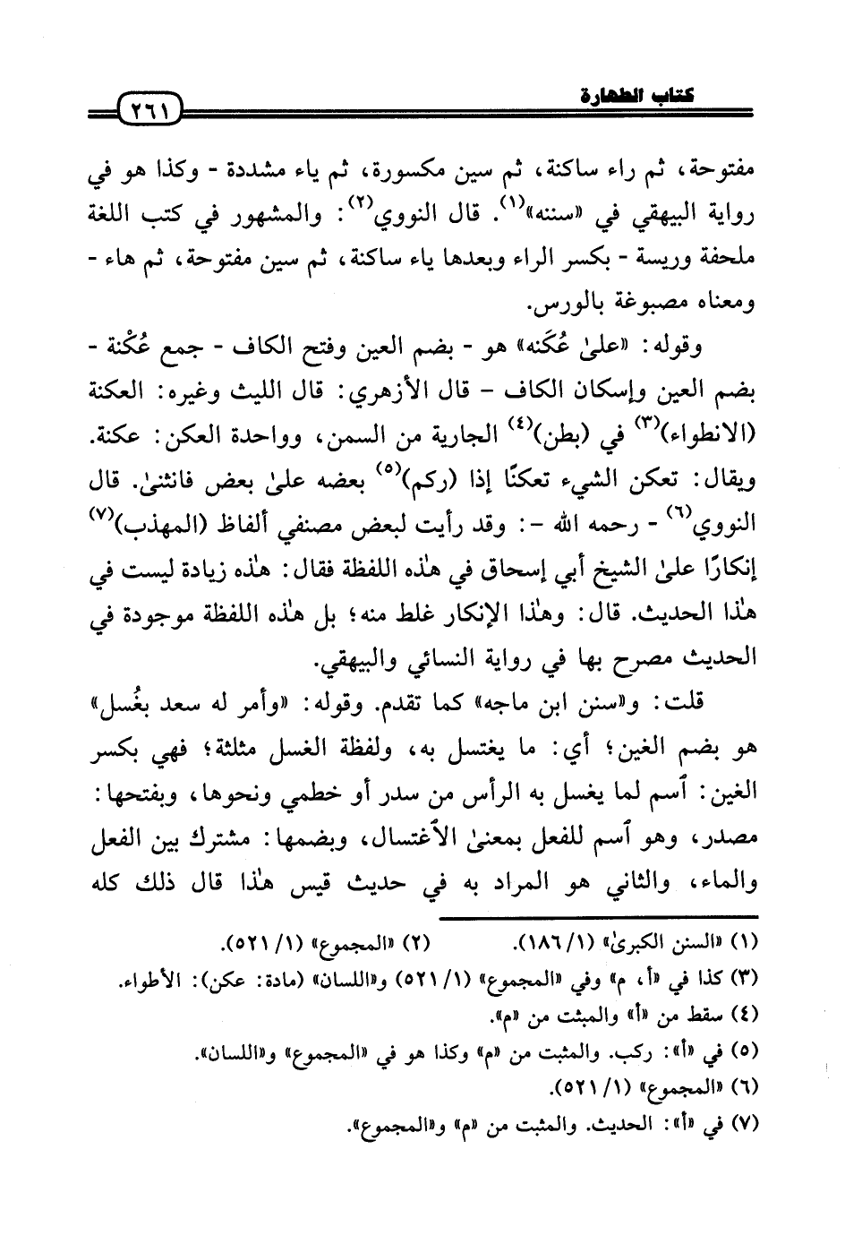 وَقَوله: «عَلَى عُكَنه» هُوَ - بِضَم الْعين وَفتح الْكَاف - جمع عُكْنة - بِضَم الْعين وَإِسْكَان الْكَاف - قَالَ الْأَزْهَرِي: قَالَ اللَّيْث وَغَيره: العكنة (الانطواء) فِي (بطن) الْجَارِيَة من السّمن، وَوَاحِدَة العكن: عكنة. وَيُقَال: تعكن الشَّيْء تعكنًا إِذا (ركم) بعضه عَلَى بعض فانثنى. قَالَ النَّوَوِيّ - رَحِمَهُ اللَّهُ -: وَقد رَأَيْت لبَعض مصنفي أَلْفَاظ (الْمُهَذّب) إنكارًا عَلَى الشَّيْخ أبي إِسْحَاق فِي هَذِه اللَّفْظَة فَقَالَ: هَذِه زِيَادَة لَيست فِي هَذَا الحَدِيث. قَالَ: وَهَذَا الْإِنْكَار غلط مِنْهُ؛ بل هَذِه اللَّفْظَة مَوْجُودَة فِي الحَدِيث مُصَرح بهَا فِي رِوَايَة النَّسَائِيّ وَالْبَيْهَقِيّ.