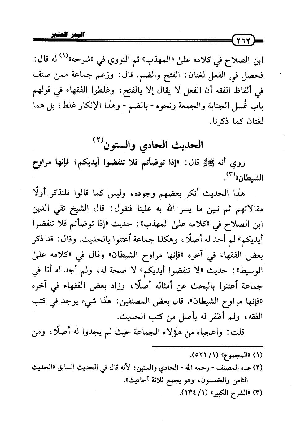 هَذَا الحَدِيث أنكر بَعضهم وجوده، وَلَيْسَ كَمَا قَالُوا فلنذكر أَولا مقالاتهم ثمَّ نبين مَا يسر الله بِهِ علينا فَنَقُول: قَالَ الشَّيْخ تَقِيّ الدَّين بن الصّلاح فِي (كَلَامه عَلَى الْمُهَذّب» : حَدِيث «إِذا توضأتم فَلَا تنفضوا أَيْدِيكُم» لم أجد لَهُ أصلا، وَهَكَذَا جمَاعَة اعتنوا بِالْحَدِيثِ. وَقَالَ: قد ذكر بعض الْفُقَهَاء فِي آخِره «فَإِنَّهَا مراوح الشَّيْطَان» وَقَالَ فِي (كَلَامه عَلَى الْوَسِيط» : حَدِيث «لَا تنفضوا أَيْدِيكُم» لَا صِحَة لَهُ، وَلم أجد لَهُ أَنا فِي جمَاعَة اعتنوا بالبحث عَن أَمْثَاله أصلا، وَزَاد بعض الْفُقَهَاء فِي آخِره «فَإِنَّهَا مراوح الشَّيْطَان» . قَالَ بعض المصنفين: هَذَا شَيْء يُوجد فِي كتب الْفِقْه، وَلم أظفر لَهُ بِأَصْل من كتب الحَدِيث.