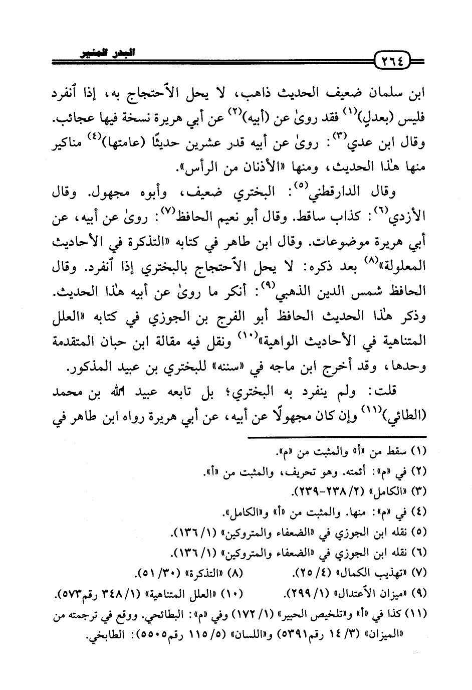 بن سلمَان ضَعِيف الحَدِيث ذَاهِب، لَا يحل الِاحْتِجَاج بِهِ، إِذا انْفَرد فَلَيْسَ (بعدلٍ) فقد رَوَى عَن (أَبِيه) عَن أبي هُرَيْرَة نُسْخَة فِيهَا عجائب. وَقَالَ ابْن عدي: رَوَى عَن أَبِيه قدر عشْرين حَدِيثا (عامتها) مَنَاكِير مِنْهَا هَذَا الحَدِيث، وَمِنْهَا «الأذنان من الرَّأْس» .