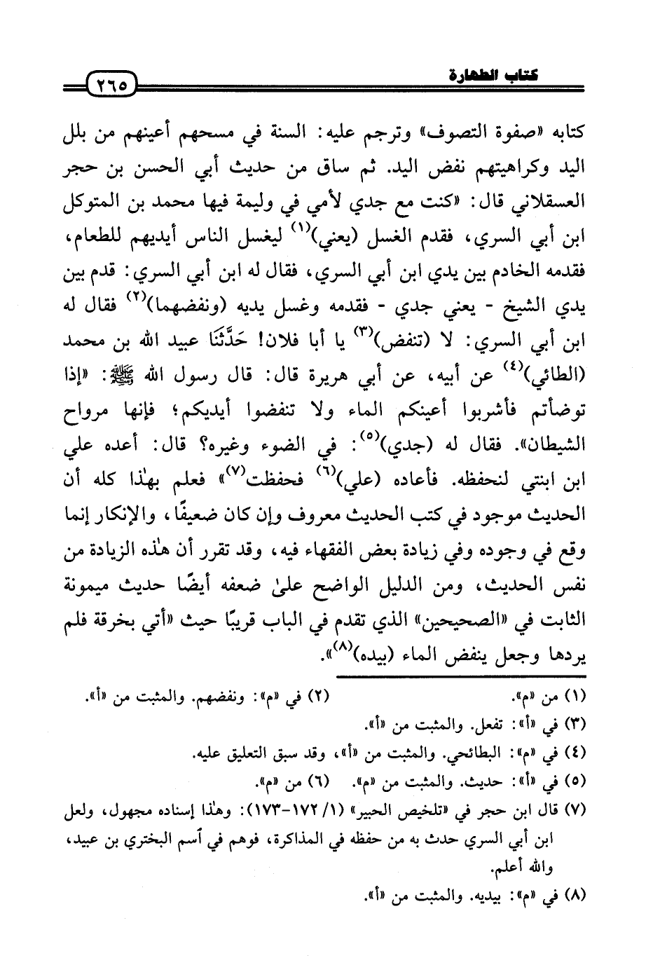 كِتَابه «صفوة التصوف» وَترْجم عَلَيْهِ: السّنة فِي مسحهم أَعينهم من بَلل الْيَد وكراهيتهم نفض الْيَد. ثمَّ سَاق من حَدِيث أبي الْحسن بن حجر الْعَسْقَلَانِي قَالَ: «كنت مَعَ جدي لأمي فِي وَلِيمَة فِيهَا مُحَمَّد بن المتَوَكل بن أبي السّري، فَقدم الْغسْل (يَعْنِي) ليغسل النَّاس أَيْديهم للطعام، فقدمه الْخَادِم بَين يَدي ابْن أبي السّري، فَقَالَ لَهُ ابْن أبي السّري: قدم بَين يَدي الشَّيْخ - يَعْنِي جدي - فقدمه وَغسل يَدَيْهِ (ونفضهما) فَقَالَ لَهُ ابْن أبي السّري: لَا (تنفض) يَا أَبَا فلَان! حَدَّثَنَا عبيد الله بن مُحَمَّد (الطَّائِي) عَن أَبِيه، عَن أبي هُرَيْرَة قَالَ: قَالَ رَسُول الله - صَلَّى الله عَلَيْهِ وَسلم -: «إِذا توضأتم فأشربوا أعينكُم المَاء وَلَا تنفضوا أَيْدِيكُم؛ فَإِنَّهَا مرواح الشَّيْطَان» . فَقَالَ لَهُ (جدي) : فِي الضَّوْء وَغَيره؟ قَالَ: أعده عَلّي ابْن ابْنَتي لنحفظه. فَأَعَادَهُ (عَلّي) فَحفِظت» فَعلم بِهَذَا كُله أَن الحَدِيث مَوْجُود فِي كتب الحَدِيث مَعْرُوف وَإِن كَانَ ضَعِيفا، وَالْإِنْكَار إِنَّمَا وَقع فِي وجوده وَفِي زِيَادَة بعض الْفُقَهَاء فِيهِ، وَقد تقرر أَن هَذِه الزِّيَادَة من نَفْس الحَدِيث، وَمن الدَّلِيل الْوَاضِح عَلَى ضعفه أَيْضا حَدِيث مَيْمُونَة الثَّابِت فِي «الصَّحِيحَيْنِ» الَّذِي تقدم فِي الْبَاب قَرِيبا حَيْثُ «أُتِي بِخرقَة فَلم يردهَا وَجعل ينفض المَاء (بِيَدِهِ) » .