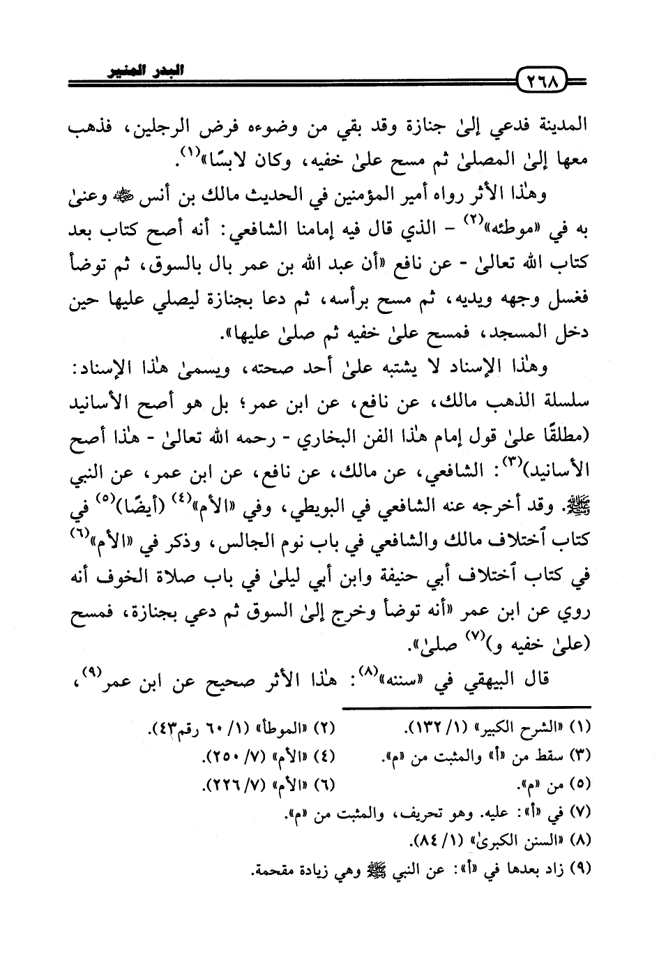 وَهَذَا الْإِسْنَاد لَا يشْتَبه عَلَى أحد صِحَّته، وَيُسمى هَذَا الْإِسْنَاد: سلسلة الذَّهَب مَالك، عَن نَافِع، عَن ابْن عمر؛ بل هُوَ أصح الْأَسَانِيد (مُطلقًا عَلَى قَول إِمَام هَذَا الْفَنّ البُخَارِيّ - رَحِمَهُ اللَّهُ تَعَالَى - هَذَا أصح الْأَسَانِيد) : الشَّافِعِي، عَن مَالك، عَن نَافِع، عَن ابْن عمر، عَن النَّبِي - صَلَّى الله عَلَيْهِ وَسلم -. وَقد أخرجه عَنهُ الشَّافِعِي فِي الْبُوَيْطِيّ، وَفِي «الْأُم» (أَيْضا) فِي كتاب اخْتِلَاف مَالك وَالشَّافِعِيّ فِي بَاب نوم الْجَالِس، وَذكر فِي «الْأُم» فِي كتاب اخْتِلَاف أبي حنيفَة وَابْن أبي لَيْلَى فِي بَاب صَلَاة الْخَوْف أَنه رُوِيَ عَن ابْن عمر «أَنه تَوَضَّأ وَخرج إِلَى السُّوق ثمَّ دعِي بِجنَازَة، فَمسح (عَلَى خفيه و) صَلَّى» .