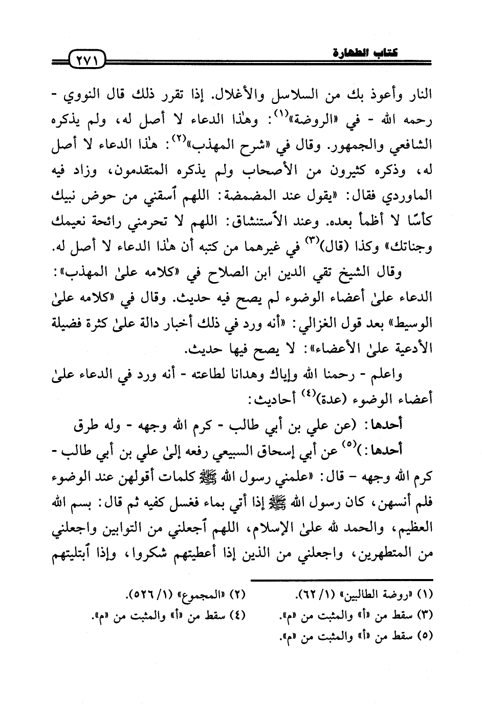 النَّار وَأَعُوذ بك من السلَاسِل والأغلال. إِذا تقرر ذَلِك قَالَ النَّوَوِيّ - رَحِمَهُ اللَّهُ - فِي «الرَّوْضَة» : وَهَذَا الدُّعَاء لَا أصل لَهُ، وَلم يذكرهُ الشَّافِعِي وَالْجُمْهُور. وَقَالَ فِي «شرح الْمُهَذّب» : هَذَا الدُّعَاء لَا أصل لَهُ، وَذكره كَثِيرُونَ من الْأَصْحَاب وَلم يذكرهُ المتقدمون، وَزَاد فِيهِ الْمَاوَرْدِيّ فَقَالَ: «يَقُول عِنْد الْمَضْمَضَة: اللَّهُمَّ اسْقِنِي من حَوْض نبيك كأسًا لَا أظمأ بعده. وَعند الِاسْتِنْشَاق: اللَّهُمَّ لَا تحرمني رَائِحَة نعيمك وجناتك» وَكَذَا (قَالَ) فِي غَيرهمَا من كتبه أَن هَذَا الدُّعَاء لَا أصل لَهُ.