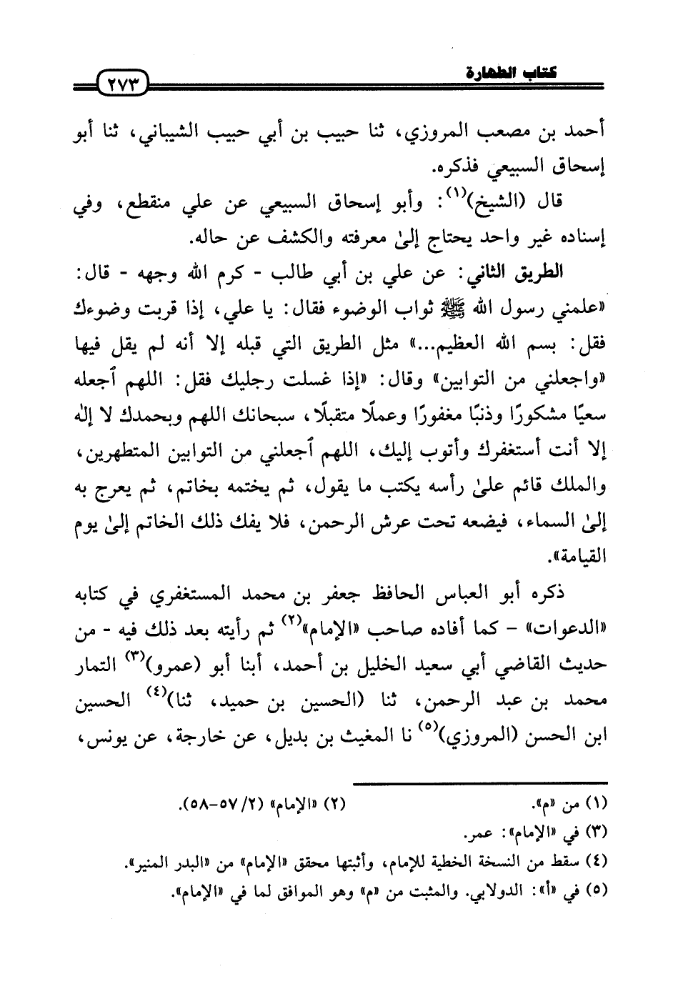 الطَّرِيق الثَّانِي: عَن عَلّي بن أبي طَالب - كرم الله وَجهه - قَالَ: «عَلمنِي رَسُول الله - صَلَّى الله عَلَيْهِ وَسلم - ثَوَاب الْوضُوء فَقَالَ: يَا عَلّي، إِذا قربت وضوءك فَقل: بِسم الله الْعَظِيم ... » مثل الطَّرِيق الَّتِي قبله إِلَّا أَنه لم يقل فِيهَا «واجعلني من التوابين» وَقَالَ: «إِذا غسلت رجليك فَقل: اللَّهُمَّ اجْعَلْهُ سعيًا مشكورًا وذنبًا مغفورًا وَعَملا متقبلاً، سُبْحَانَكَ اللَّهُمَّ وَبِحَمْدِك لَا إِلَه إِلَّا أَنْت أستغفرك وَأَتُوب إِلَيْك، اللَّهُمَّ اجْعَلنِي من التوابين المتطهرين، وَالْملك قَائِم عَلَى رَأسه يكْتب مَا يَقُول، ثمَّ يختمه بِخَاتم، ثمَّ يعرج بِهِ إِلَى السَّمَاء، فيضعه تَحت عرش الرَّحْمَن، فَلَا يفك ذَلِك الْخَاتم إِلَى يَوْم الْقِيَامَة» .