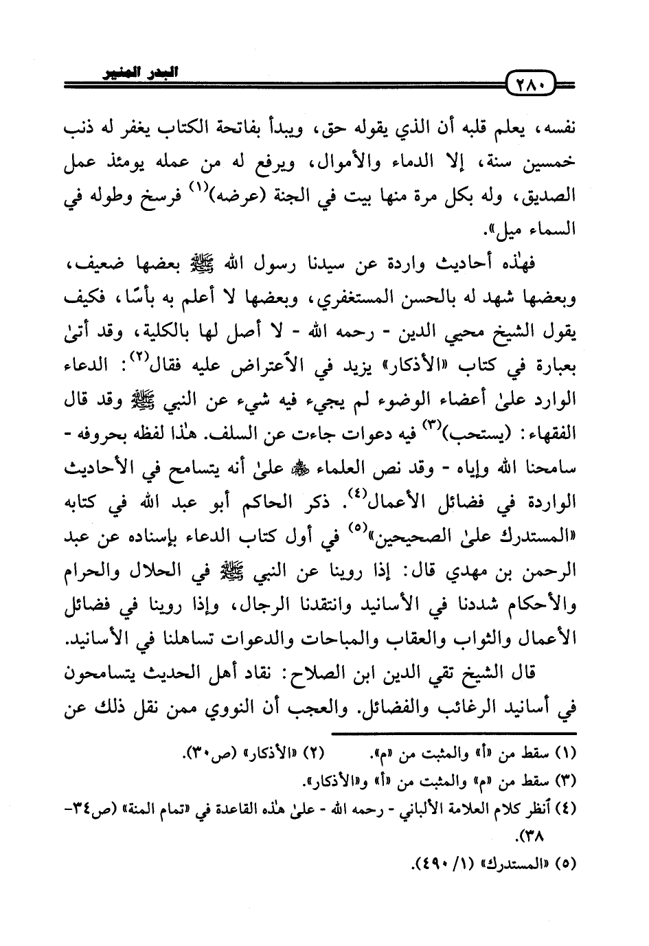 فَهَذِهِ أَحَادِيث وَارِدَة عَن سيدنَا رَسُول الله - صَلَّى الله عَلَيْهِ وَسلم - بَعْضهَا ضَعِيف، وَبَعضهَا شهد لَهُ بالْحسنِ المستغفري، وَبَعضهَا لَا أعلم بِهِ بَأْسا، فَكيف يَقُول الشَّيْخ محيي الدَّين - رَحِمَهُ اللَّهُ - لَا أصل لَهَا بِالْكُلِّيَّةِ، وَقد أَتَى بِعِبَارَة فِي كتاب «الْأَذْكَار» يزِيد فِي الِاعْتِرَاض عَلَيْهِ فَقَالَ: الدُّعَاء الْوَارِد عَلَى أَعْضَاء الْوضُوء لم يَجِيء فِيهِ شَيْء عَن النَّبِي - صَلَّى الله عَلَيْهِ وَسلم - وَقد قَالَ الْفُقَهَاء: (يسْتَحبّ) فِيهِ دعوات جَاءَت عَن السّلف. هَذَا لَفظه بِحُرُوفِهِ - سامحنا الله وإياه - وَقد نَص الْعلمَاء رَضي اللهُ عَنهم عَلَى أَنه يتَسَامَح فِي الْأَحَادِيث الْوَارِدَة فِي فَضَائِل الْأَعْمَال. ذكر الْحَاكِم أَبُو عبد الله فِي كِتَابه «الْمُسْتَدْرك عَلَى الصَّحِيحَيْنِ» فِي أول كتاب الدُّعَاء بِإِسْنَادِهِ عَن عبد الرَّحْمَن بن مهْدي قَالَ: إِذا روينَا عَن النَّبِي - صَلَّى الله عَلَيْهِ وَسلم - فِي الْحَلَال وَالْحرَام وَالْأَحْكَام شددنا فِي الْأَسَانِيد وانتقدنا الرِّجَال، وَإِذا روينَا فِي فَضَائِل الْأَعْمَال وَالثَّوَاب وَالْعِقَاب والمباحات والدعوات تساهلنا فِي الْأَسَانِيد.