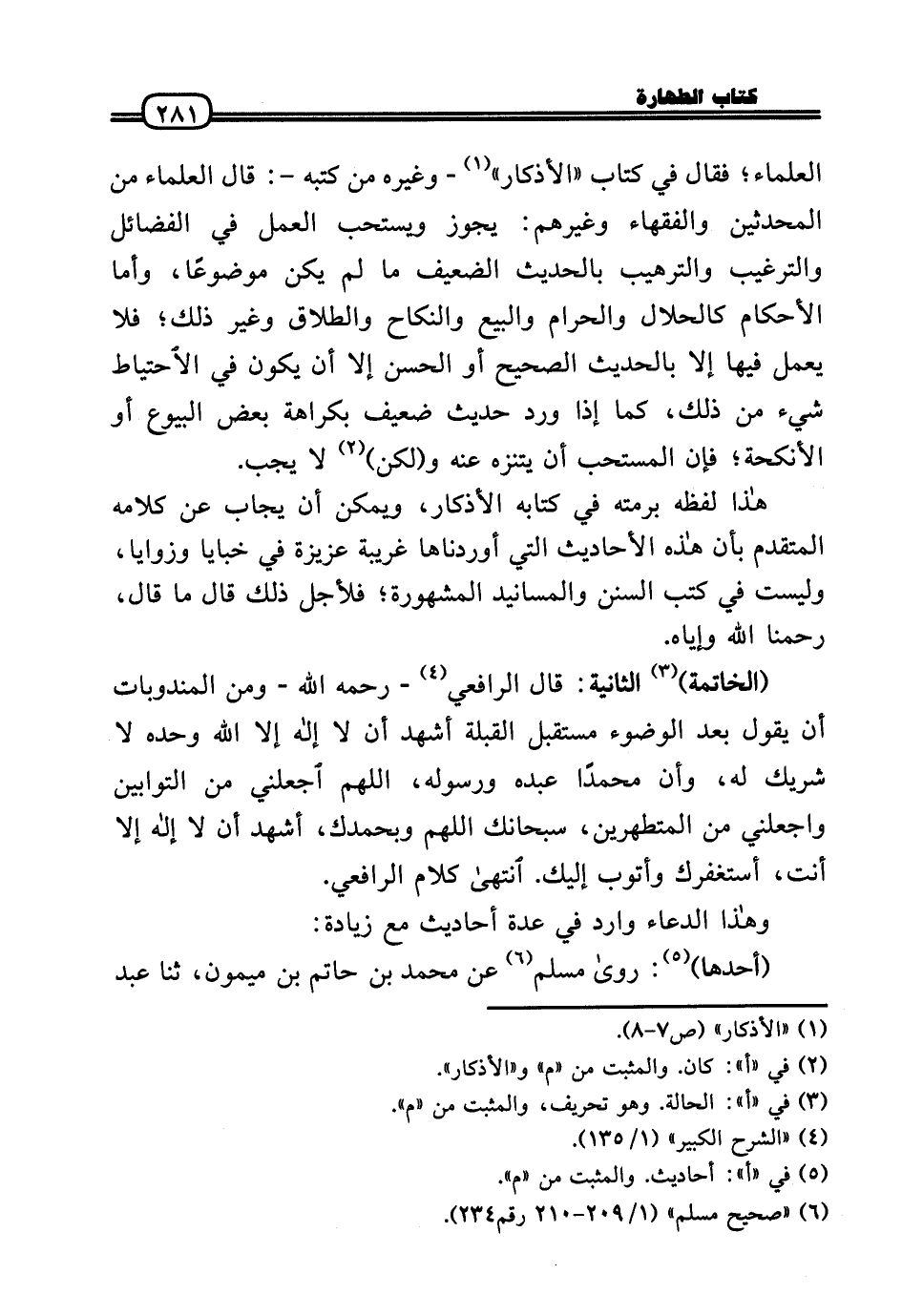 (الخاتمة) الثَّانِيَة: قَالَ الرَّافِعِيّ - رَحِمَهُ اللَّهُ - وَمن المندوبات أَن يَقُول بعد الْوضُوء مُسْتَقْبل الْقبْلَة أشهد أَن لَا إِلَه إِلَّا الله وَحده لَا شريك لَهُ، وَأَن مُحَمَّدًا عَبده وَرَسُوله، اللَّهُمَّ اجْعَلنِي من التوابين واجعلني من المتطهرين، سُبْحَانَكَ اللَّهُمَّ وَبِحَمْدِك، أشهد أَن لَا إِلَه إِلَّا أَنْت، أستغفرك وَأَتُوب إِلَيْك. انْتَهَى كَلَام الرَّافِعِيّ.