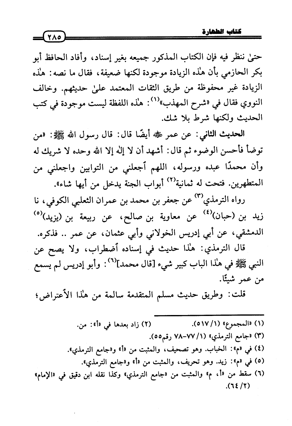 حَتَّى نَنْظُر فِيهِ فَإِن الْكتاب الْمَذْكُور جَمِيعه بِغَيْر إِسْنَاد، وَأفَاد الْحَافِظ أَبُو بكر الْحَازِمِي بِأَن هَذِه الزِّيَادَة مَوْجُودَة لَكِنَّهَا ضَعِيفَة، فَقَالَ مَا نَصه: هَذِه الزِّيَادَة غير مَحْفُوظَة من طَرِيق الثِّقَات الْمُعْتَمد عَلَى حَدِيثهمْ. وَخَالف النَّوَوِيّ فَقَالَ فِي «شرح الْمُهَذّب» : هَذِه اللَّفْظَة لَيست مَوْجُودَة فِي كتب الحَدِيث وَلكنهَا شَرط بِلَا شكّ.