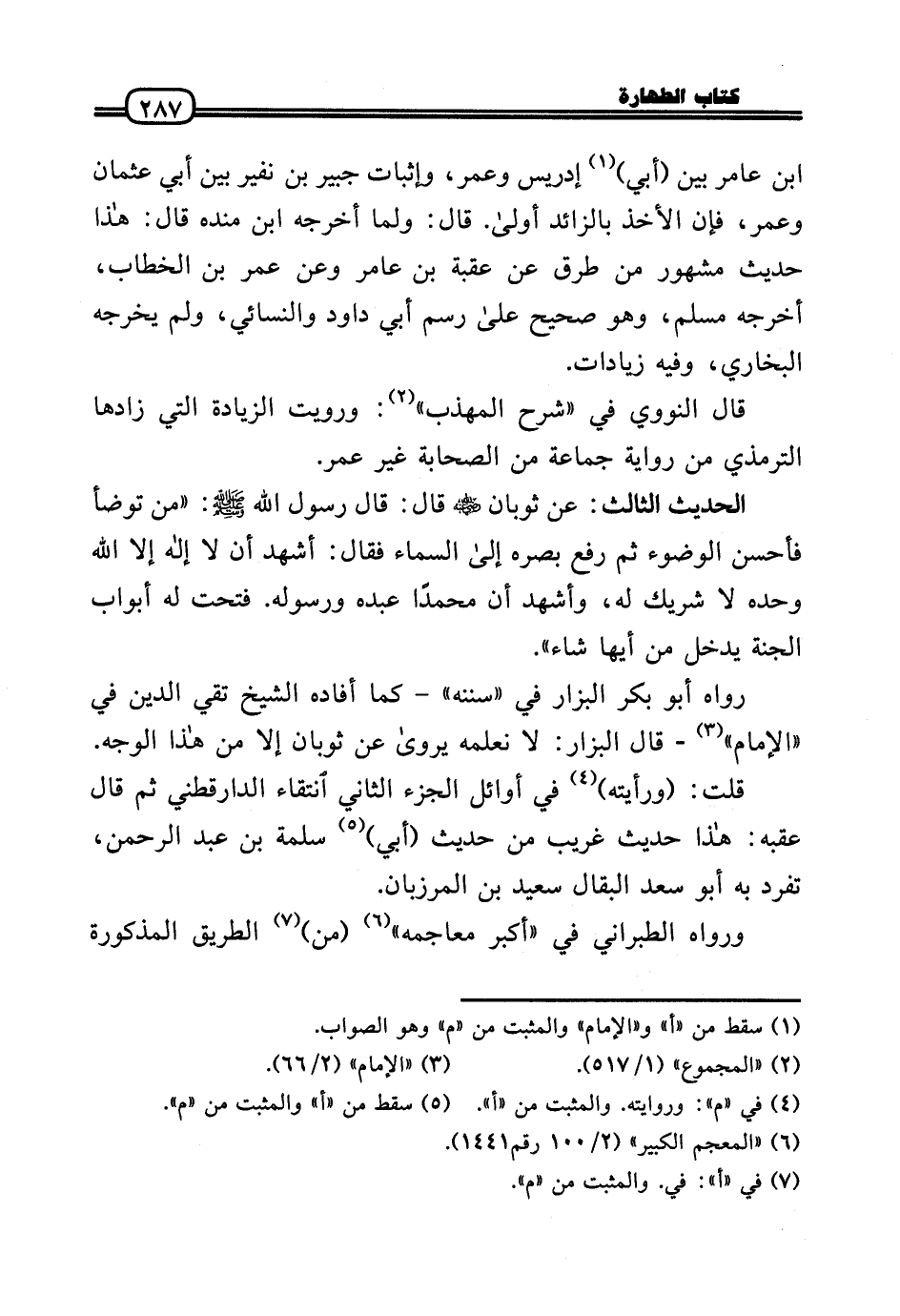 بن عَامر بَين (أبي) إِدْرِيس وَعمر، وَإِثْبَات جُبَير بن نفير بَين أبي عُثْمَان وَعمر، فَإِن الْأَخْذ بِالزَّائِدِ أولَى. قَالَ: وَلما أخرجه ابْن مَنْدَه قَالَ: هَذَا حَدِيث مَشْهُور من طرق عَن عقبَة بن عَامر وَعَن عمر بن الْخطاب، أخرجه مُسلم، وَهُوَ صَحِيح عَلَى رسم أبي دَاوُد وَالنَّسَائِيّ، وَلم يُخرجهُ البُخَارِيّ، وَفِيه زيادات.
