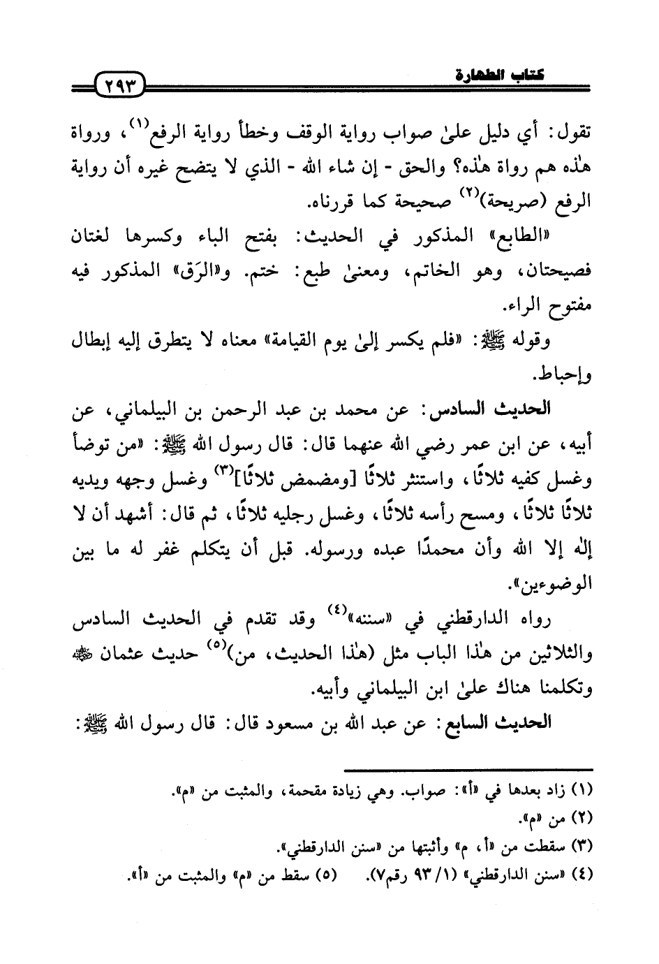 الحَدِيث السَّادِس: عَن مُحَمَّد بن عبد الرَّحْمَن بن الْبَيْلَمَانِي، عَن أَبِيه، عَن ابْن عمر رَضي اللهُ عَنهما قَالَ: قَالَ رَسُول الله - صَلَّى الله عَلَيْهِ وَسلم -: «من تَوَضَّأ وَغسل كفيه ثَلَاثًا، واستنثر ثَلَاثًا [ومضمض ثَلَاثًا] وَغسل وَجهه وَيَديه ثَلَاثًا ثَلَاثًا، وَمسح رَأسه ثَلَاثًا، وَغسل رجلَيْهِ ثَلَاثًا، ثمَّ قَالَ: أشهد أَن لَا إِلَه إِلَّا الله وَأَن مُحَمَّدًا عَبده وَرَسُوله. قبل أَن يتَكَلَّم غفر لَهُ مَا بَين الوضوءين» .
