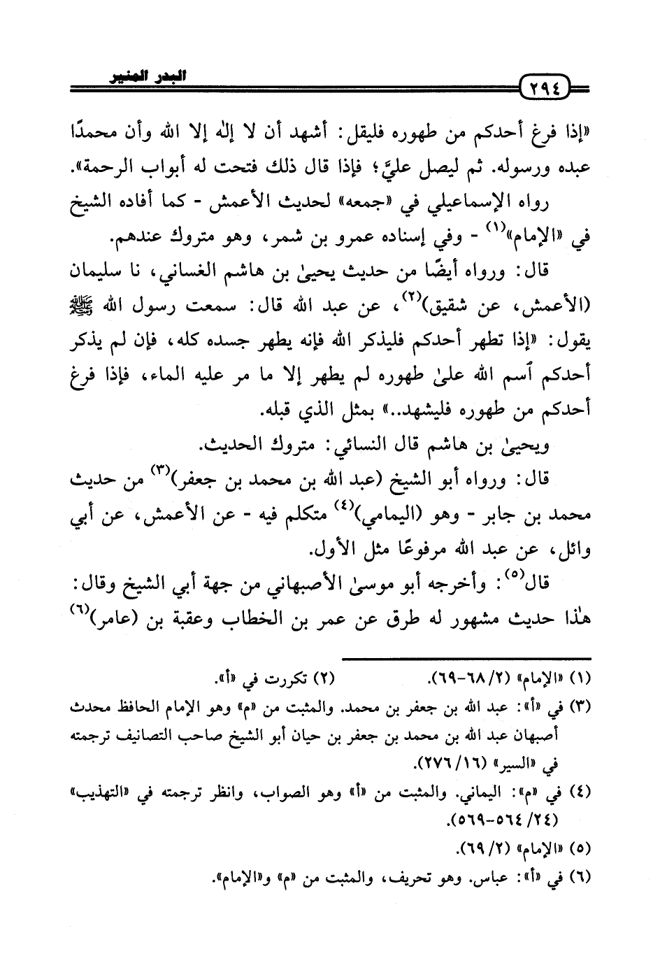 قَالَ: وَرَوَاهُ أَيْضا من حَدِيث يَحْيَى بن هَاشم الغساني، نَا سُلَيْمَان (الْأَعْمَش، عَن شَقِيق) ، عَن عبد الله قَالَ: سَمِعت رَسُول الله - صَلَّى الله عَلَيْهِ وَسلم - يَقُول: «إِذا تطهر أحدكُم فليذكر الله فَإِنَّهُ يطهر جسده كُله، فَإِن لم يذكر أحدكُم اسْم الله عَلَى طهوره لم يطهر إِلَّا مَا مر عَلَيْهِ المَاء، فَإِذا فرغ أحدكُم من طهوره فليشهد. .» بِمثل الَّذِي قبله.