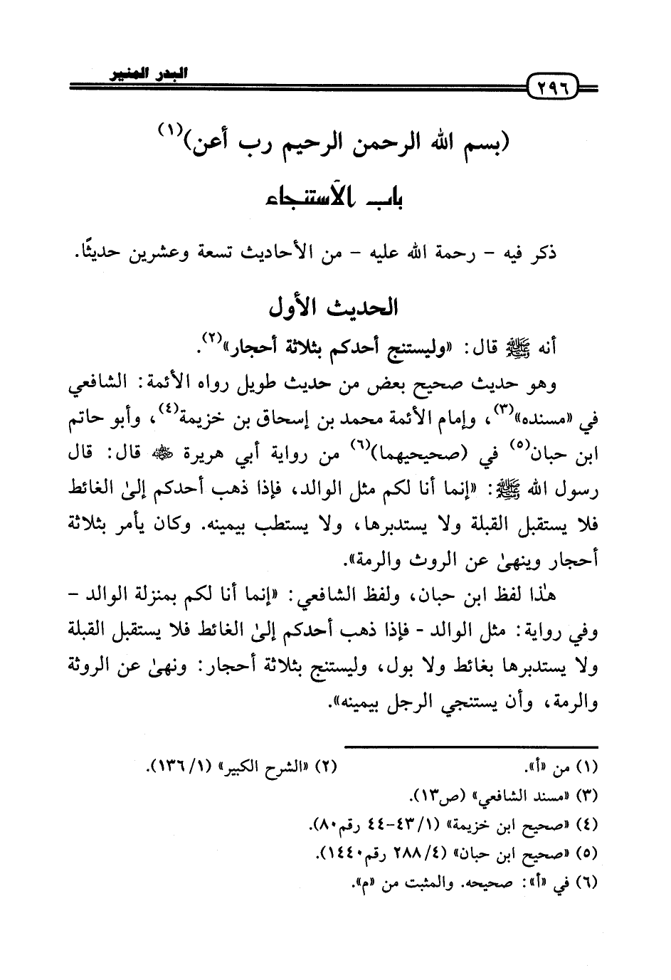 وَهُوَ حَدِيث صَحِيح بعض من حَدِيث طَوِيل رَوَاهُ الْأَئِمَّة: الشَّافِعِي فِي «مُسْنده» ، وَإِمَام الْأَئِمَّة مُحَمَّد بن إِسْحَاق بن خُزَيْمَة، وَأَبُو حَاتِم بن حبَان فِي (صَحِيحَيْهِمَا) من رِوَايَة أبي هُرَيْرَة رَضي اللهُ عَنهُ قَالَ: قَالَ رَسُول الله - صَلَّى الله عَلَيْهِ وَسلم -: «إِنَّمَا أَنا لكم مثل الْوَالِد، فَإِذا ذهب أحدكُم إِلَى الْغَائِط فَلَا يسْتَقْبل الْقبْلَة وَلَا يستدبرها، وَلَا يستطب بِيَمِينِهِ. وَكَانَ يَأْمر بِثَلَاثَة أَحْجَار وَينْهَى عَن الروث والرمة» .