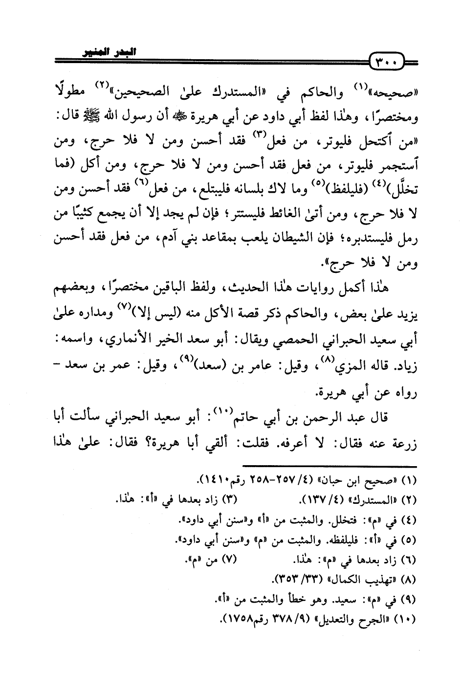 «صَحِيحه» وَالْحَاكِم فِي «الْمُسْتَدْرك عَلَى الصَّحِيحَيْنِ» مطولا ومختصرًا، وَهَذَا لفظ أبي دَاوُد عَن أبي هُرَيْرَة رَضي اللهُ عَنهُ أَن رَسُول الله - صَلَّى الله عَلَيْهِ وَسلم - قَالَ: «من اكتحل فليوتر، من فعل فقد أحسن وَمن لَا فَلَا حرج، وَمن استجمر فليوتر، من فعل فقد أحسن وَمن لَا فَلَا حرج، وَمن أكل (فَمَا تخلَّل) (فليلفظ) وَمَا لاك بِلِسَانِهِ فليبتلع، من فعل فقد أحسن وَمن لَا فَلَا حرج، وَمن أَتَى الْغَائِط فليستتر؛ فَإِن لم يجد إِلَّا أَن يجمع كثيبًا من رمل فليستدبره؛ فَإِن الشَّيْطَان يلْعَب بمقاعد بني آدم، من فعل فقد أحسن وَمن لَا فَلَا حرج» .