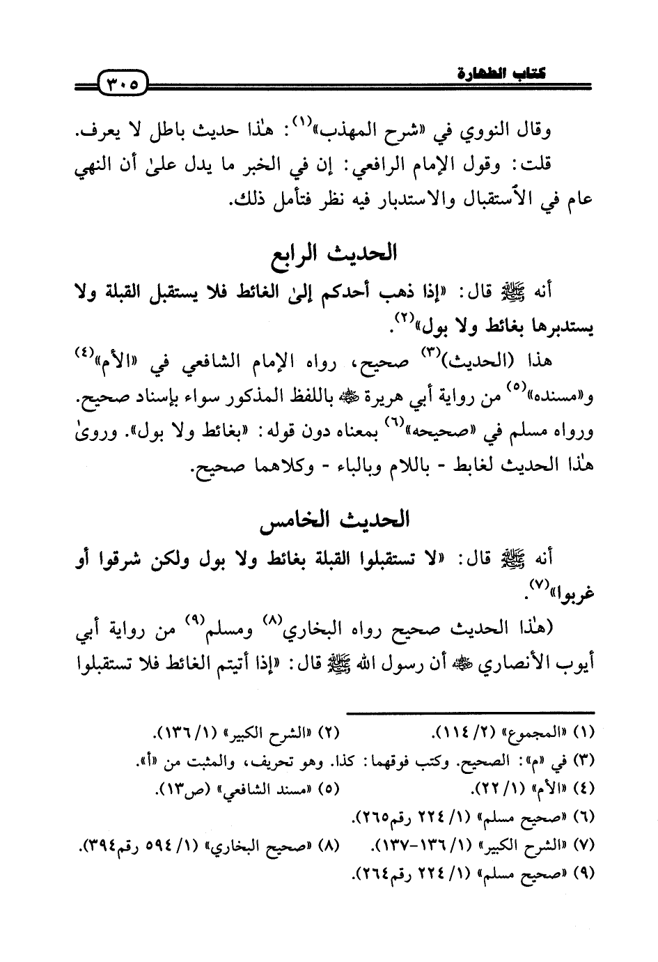 هَذ (الحَدِيث) صَحِيح، رَوَاهُ الإِمَام الشَّافِعِي فِي «الْأُم» و «مُسْنده» من رِوَايَة أبي هُرَيْرَة رَضي اللهُ عَنهُ بِاللَّفْظِ الْمَذْكُور سَوَاء بِإِسْنَاد صَحِيح. وَرَوَاهُ مُسلم فِي «صَحِيحه» بِمَعْنَاهُ دون قَوْله: «بغائط وَلَا بَوْل» . وَرَوَى هَذَا الحَدِيث لغابط - بِاللَّامِ وبالباء - وَكِلَاهُمَا صَحِيح.