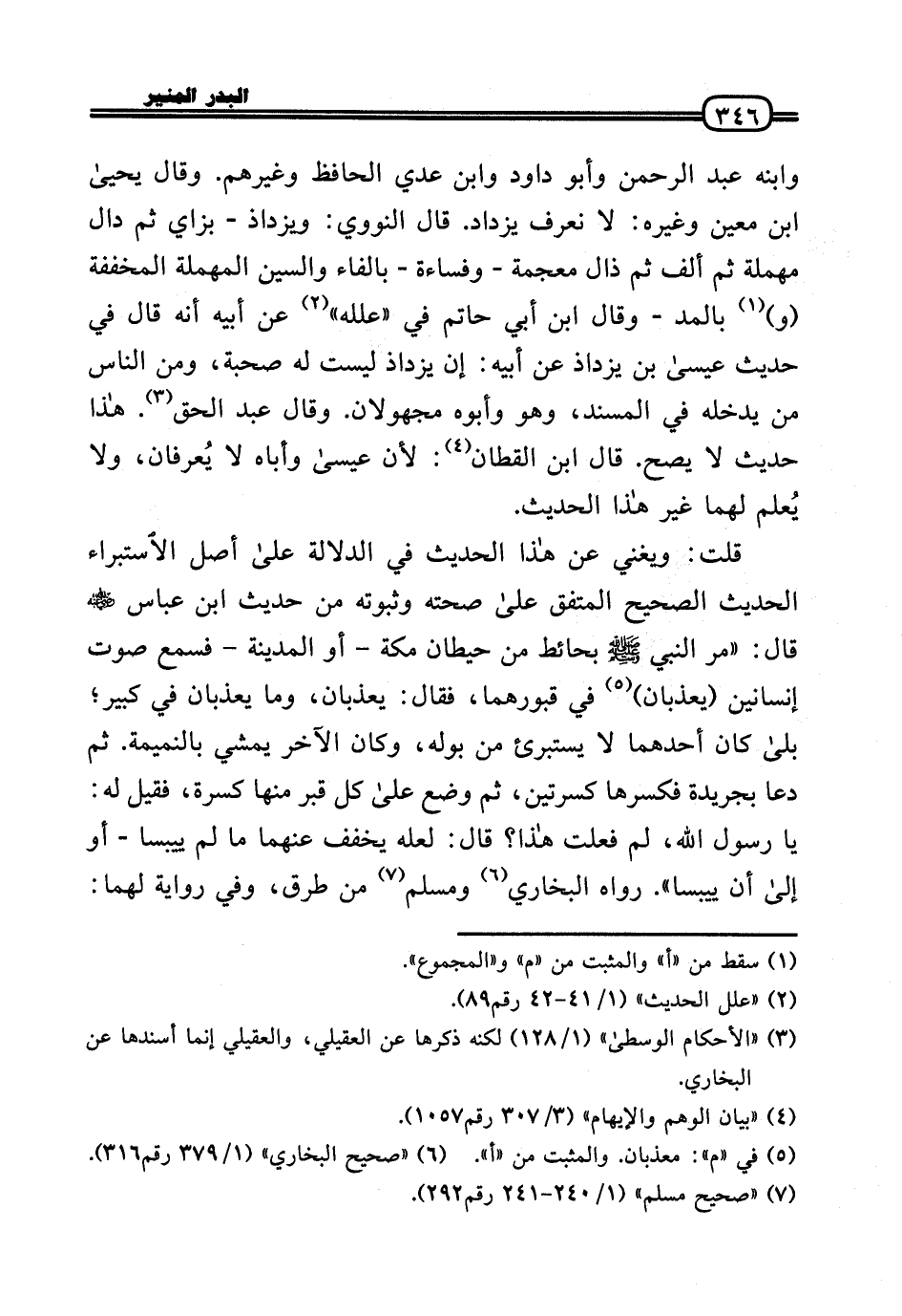 قلت: ويغني عَن هَذَا الحَدِيث فِي الدّلَالَة عَلَى أصل الِاسْتِبْرَاء الحَدِيث الصَّحِيح الْمُتَّفق عَلَى صِحَّته وثبوته من حَدِيث ابْن عَبَّاس رَضي اللهُ عَنهُ قَالَ: «مر النَّبِي - صَلَّى الله عَلَيْهِ وَسلم - بحائط من حيطان مَكَّة - أَو الْمَدِينَة - فَسمع صَوت إنسانين (يعذبان) فِي قبورهما، فَقَالَ: يعذبان، وَمَا يعذبان فِي كَبِير؛ بلَى كَانَ أَحدهمَا لَا يستبرئ من بَوْله، وَكَانَ الآخر يمشي بالنميمة. ثمَّ دَعَا بجريدة فَكَسرهَا كسرتين، ثمَّ وضع عَلَى كل قبر مِنْهَا كسرة، فَقيل لَهُ: يَا رَسُول الله، لم فعلت هَذَا؟ قَالَ: لَعَلَّه يُخَفف عَنْهُمَا مَا لم ييبسا - أَو إِلَى أَن ييبسا» . رَوَاهُ البُخَارِيّ وَمُسلم من طرق، وَفِي رِوَايَة لَهما:
