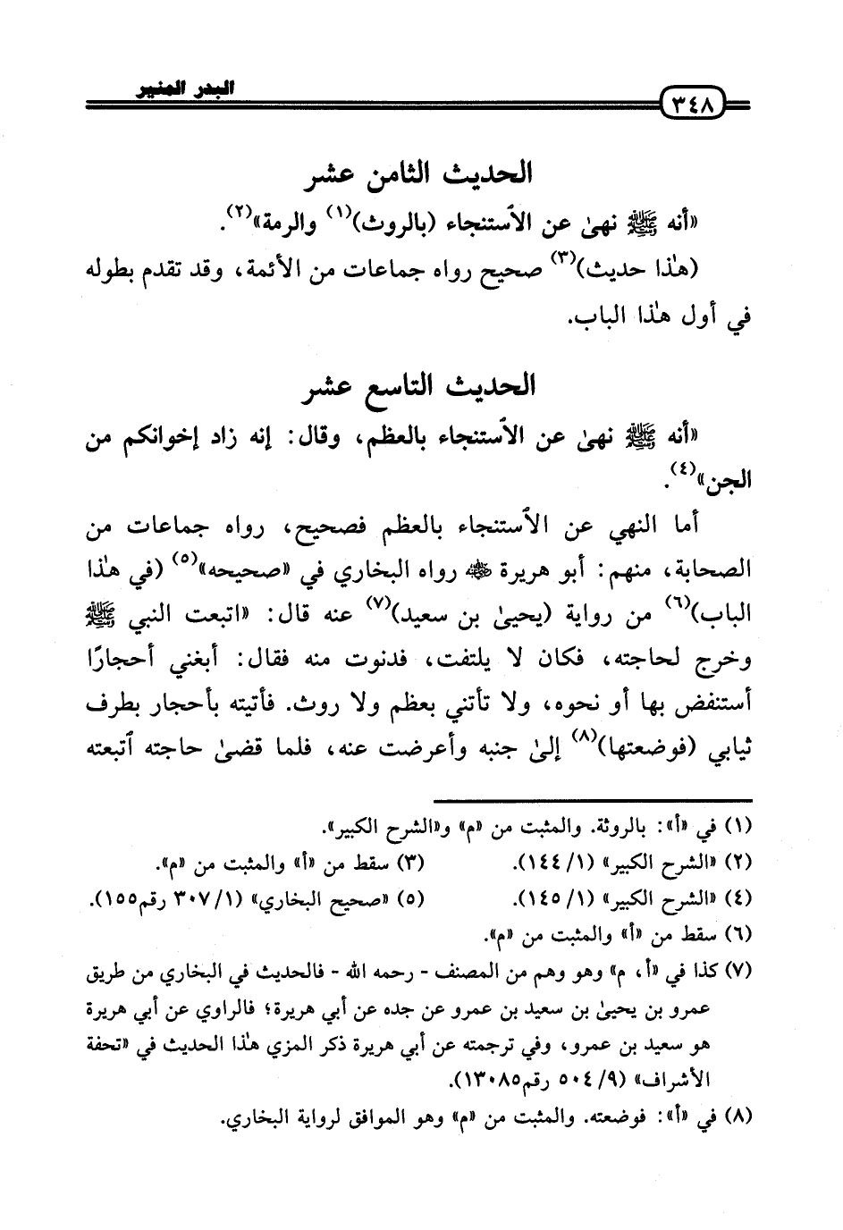 أما النَّهْي عَن الِاسْتِنْجَاء بالعظم فَصَحِيح، رَوَاهُ جماعات من الصَّحَابَة، مِنْهُم: أَبُو هُرَيْرَة رَضي اللهُ عَنهُ رَوَاهُ البُخَارِيّ فِي «صَحِيحه» (فِي هَذَا الْبَاب) من رِوَايَة (يَحْيَى بن سعيد) عَنهُ قَالَ: «اتبعت النَّبِي - صَلَّى الله عَلَيْهِ وَسلم - وَخرج لِحَاجَتِهِ، فَكَانَ لَا يلْتَفت، فدنوت مِنْهُ فَقَالَ: أبغني أحجارًا أستنفض بهَا أَو نَحوه، وَلَا تأتني بِعظم وَلَا رَوْث. فَأَتَيْته بأحجار بِطرف ثِيَابِي (فَوَضَعتهَا) إِلَى جنبه وأعرضت عَنهُ، فَلَمَّا قَضَى حَاجته اتبعته