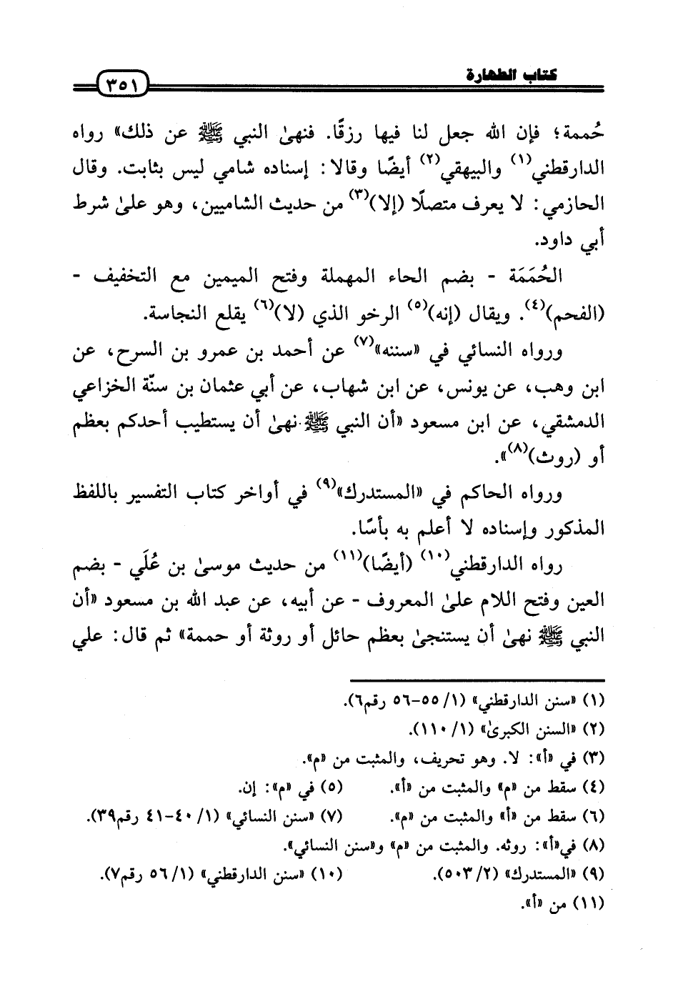 حُممة؛ فَإِن الله جعل لنا فِيهَا رزقا. فَنَهَى النَّبِي - صَلَّى الله عَلَيْهِ وَسلم - عَن ذَلِك» رَوَاهُ الدَّارَقُطْنِيّ وَالْبَيْهَقِيّ أَيْضا وَقَالا: إِسْنَاده شَامي لَيْسَ بِثَابِت. وَقَالَ الْحَازِمِي: لَا يعرف مُتَّصِلا (إِلَّا) من حَدِيث الشاميين، وَهُوَ عَلَى شَرط أبي دَاوُد.