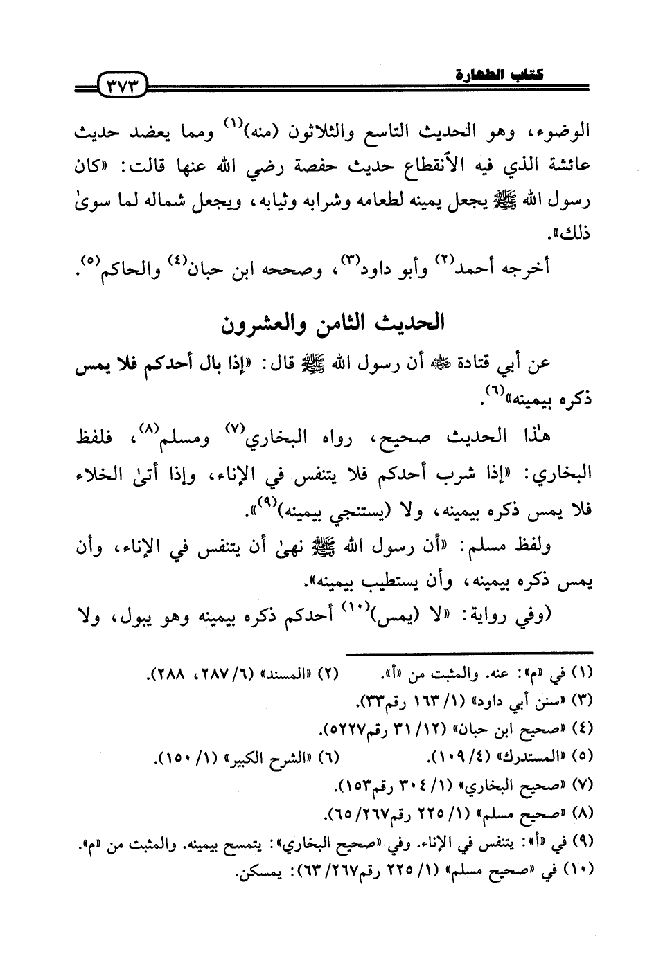 الْوضُوء، وَهُوَ الحَدِيث التَّاسِع وَالثَّلَاثُونَ (مِنْهُ) وَمِمَّا يعضد حَدِيث عَائِشَة الَّذِي فِيهِ الِانْقِطَاع حَدِيث حَفْصَة رَضي اللهُ عَنها قَالَت: «كَانَ رَسُول الله - صَلَّى الله عَلَيْهِ وَسلم - يَجْعَل يَمِينه لطعامه وَشَرَابه وثيابه، وَيجْعَل شِمَاله لما سُوَى ذَلِك» .
