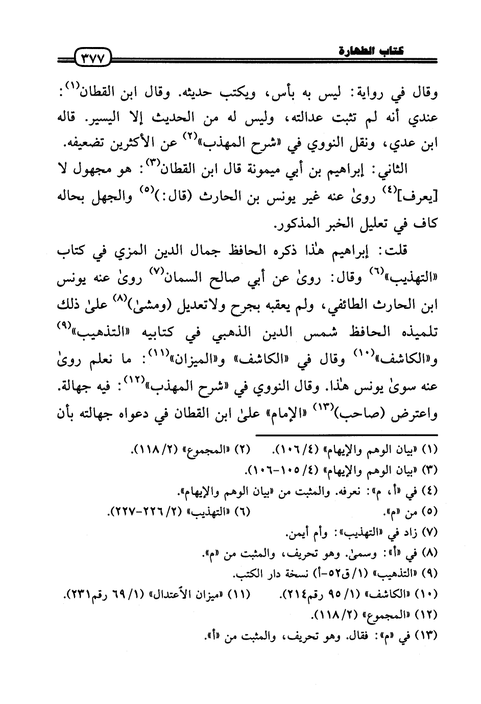قلت: إِبْرَاهِيم هَذَا ذكره الْحَافِظ جمال الدَّين الْمزي فِي كتاب «التَّهْذِيب» وَقَالَ: رَوَى عَن أبي صَالح السمان رَوَى عَنهُ يُونُس بن الْحَارِث الطَّائِفِي، وَلم يعقبه بِجرح ولاتعديل (وَمَشى) عَلَى ذَلِك تِلْمِيذه الْحَافِظ شمس الدَّين الذَّهَبِيّ فِي كِتَابيه «التذهيب» و «الكاشف» وَقَالَ فِي «الكاشف» و «الْمِيزَان» : مَا نعلم رَوَى عَنهُ سُوَى يُونُس هَذَا. وَقَالَ النَّوَوِيّ فِي «شرح الْمُهَذّب» : فِيهِ جَهَالَة. وَاعْترض (صَاحب) «الإِمَام» عَلَى ابْن الْقطَّان فِي دَعْوَاهُ جهالته بِأَن