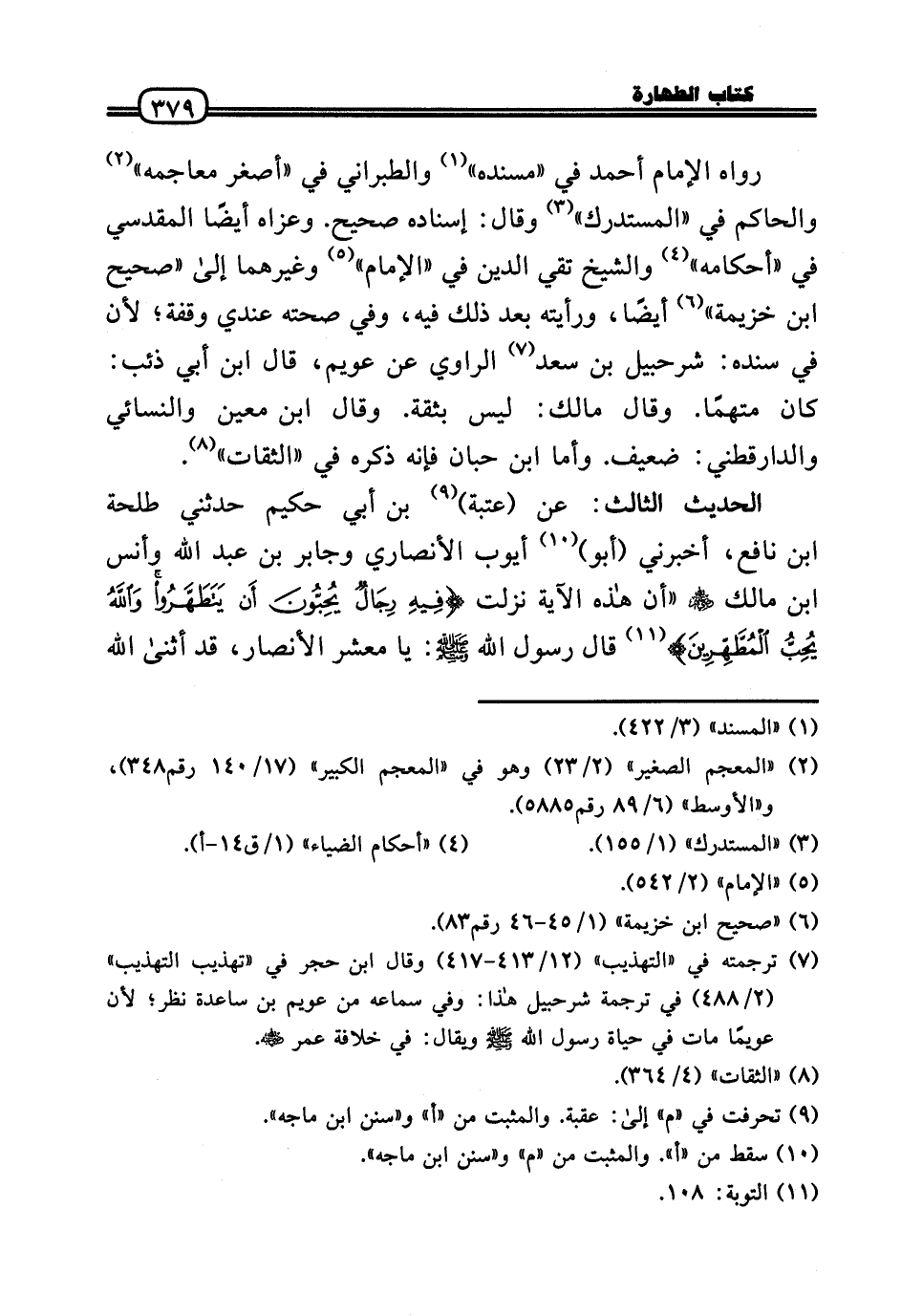 الحَدِيث الثَّالِث: عَن (عتبَة) بن أبي حَكِيم حَدثنِي طَلْحَة بن نَافِع، أَخْبرنِي (أَبُو) أَيُّوب الْأنْصَارِيّ وَجَابِر بن عبد الله وَأنس بن مَالك رَضي اللهُ عَنهم «أَن هَذِه الْآيَة نزلت (فِيهِ رجال يحبونَ أَن يَتَطَهَّرُوا وَالله يحب المطهرين) قَالَ رَسُول الله - صَلَّى الله عَلَيْهِ وَسلم -: يَا معشر الْأَنْصَار، قد أَثْنَى الله