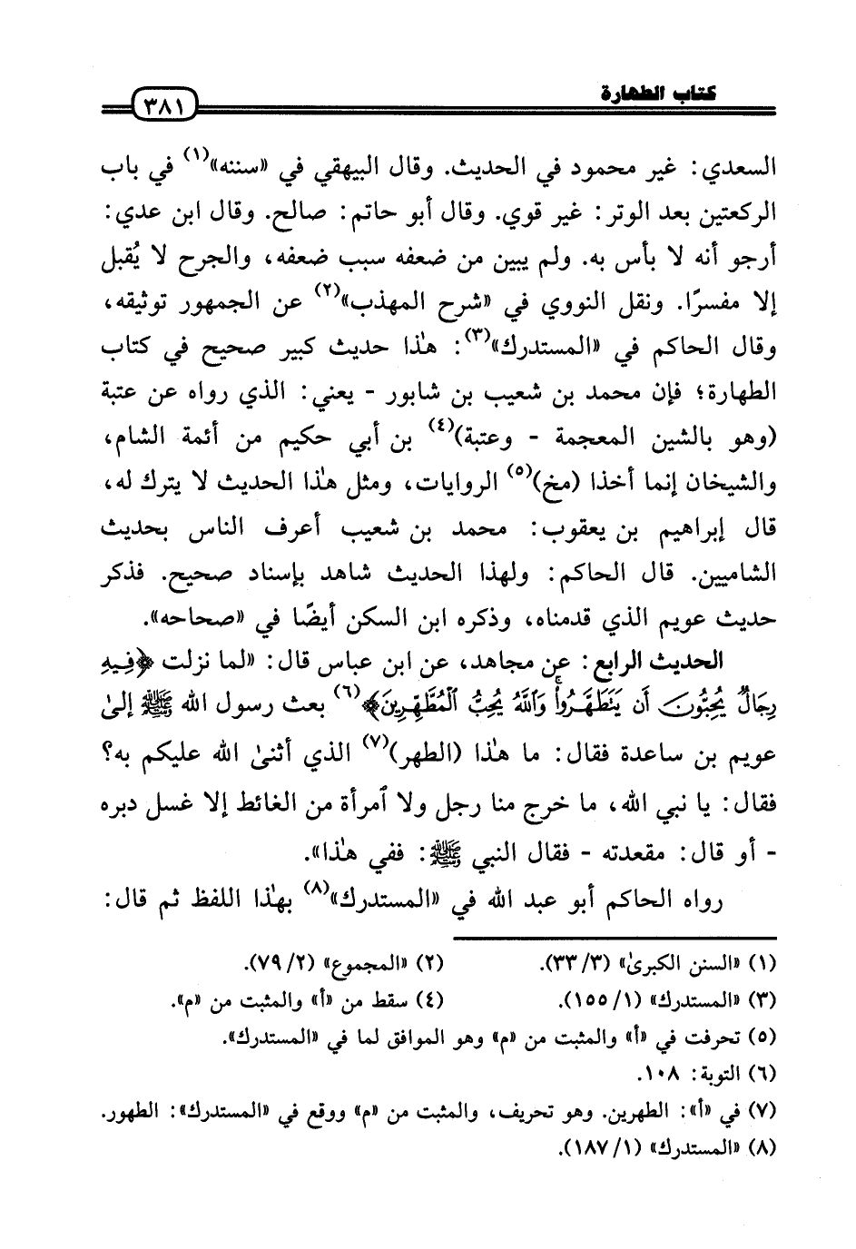 السَّعْدِيّ: غير مَحْمُود فِي الحَدِيث. وَقَالَ الْبَيْهَقِيّ فِي «سنَنه» فِي بَاب الرَّكْعَتَيْنِ بعد الْوتر: غير قوي. وَقَالَ أَبُو حَاتِم: صَالح. وَقَالَ ابْن عدي: أَرْجُو أَنه لَا بَأْس بِهِ. وَلم يبين من ضعفه سَبَب ضعفه، وَالْجرْح لَا يُقبل إِلَّا مُفَسرًا. وَنقل النَّوَوِيّ فِي «شرح الْمُهَذّب» عَن الْجُمْهُور توثيقه، وَقَالَ الْحَاكِم فِي «الْمُسْتَدْرك» : هَذَا حَدِيث كَبِير صَحِيح فِي كتاب الطَّهَارَة؛ فَإِن مُحَمَّد بن شُعَيْب بن شَابُور - يَعْنِي: الَّذِي رَوَاهُ عَن عتبَة (وَهُوَ بالشين الْمُعْجَمَة - وَعتبَة) بن أبي حَكِيم من أَئِمَّة الشَّام، والشيخان إِنَّمَا أخذا (مخ) الرِّوَايَات، وَمثل هَذَا الحَدِيث لَا يتْرك لَهُ، قَالَ إِبْرَاهِيم بن يَعْقُوب: مُحَمَّد بن شُعَيْب أعرف النَّاس بِحَدِيث الشاميين. قَالَ الْحَاكِم: وَلِهَذَا الحَدِيث شَاهد بِإِسْنَاد صَحِيح. فَذكر حَدِيث عويم الَّذِي قدمْنَاهُ، وَذكره ابْن السكن أَيْضا فِي «صحاحه» .