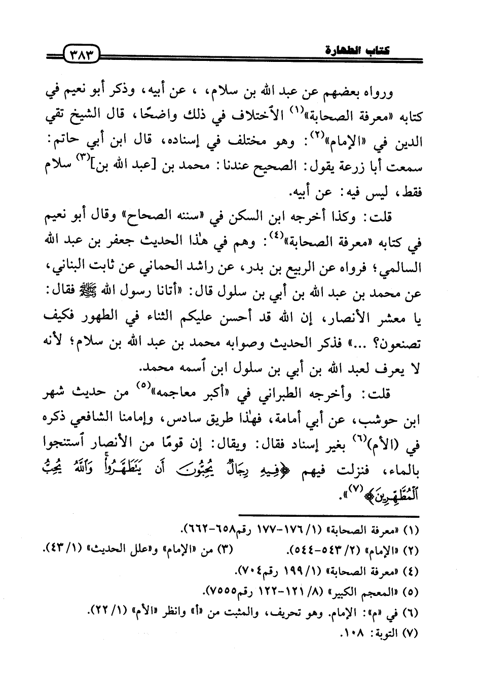 قلت: وَكَذَا أخرجه ابْن السكن فِي «سنَنه الصِّحَاح» وَقَالَ أَبُو نعيم فِي كِتَابه «معرفَة الصَّحَابَة» : وهم فِي هَذَا الحَدِيث جَعْفَر بن عبد الله السالمي؛ فَرَوَاهُ عَن الرّبيع بن بدر، عَن رَاشد الْحمانِي عَن ثَابت الْبنانِيّ، عَن مُحَمَّد بن عبد الله بن أبي بن سلول قَالَ: «أَتَانَا رَسُول الله - صَلَّى الله عَلَيْهِ وَسلم - فَقَالَ: يَا معشر الْأَنْصَار، إِن الله قد أحسن عَلَيْكُم الثَّنَاء فِي الطّهُور فَكيف تَصْنَعُونَ؟ ... » فَذكر الحَدِيث وَصَوَابه مُحَمَّد بن عبد الله بن سَلام؛ لِأَنَّهُ لَا يعرف لعبد الله بن أبي بن سلول ابْن اسْمه مُحَمَّد.