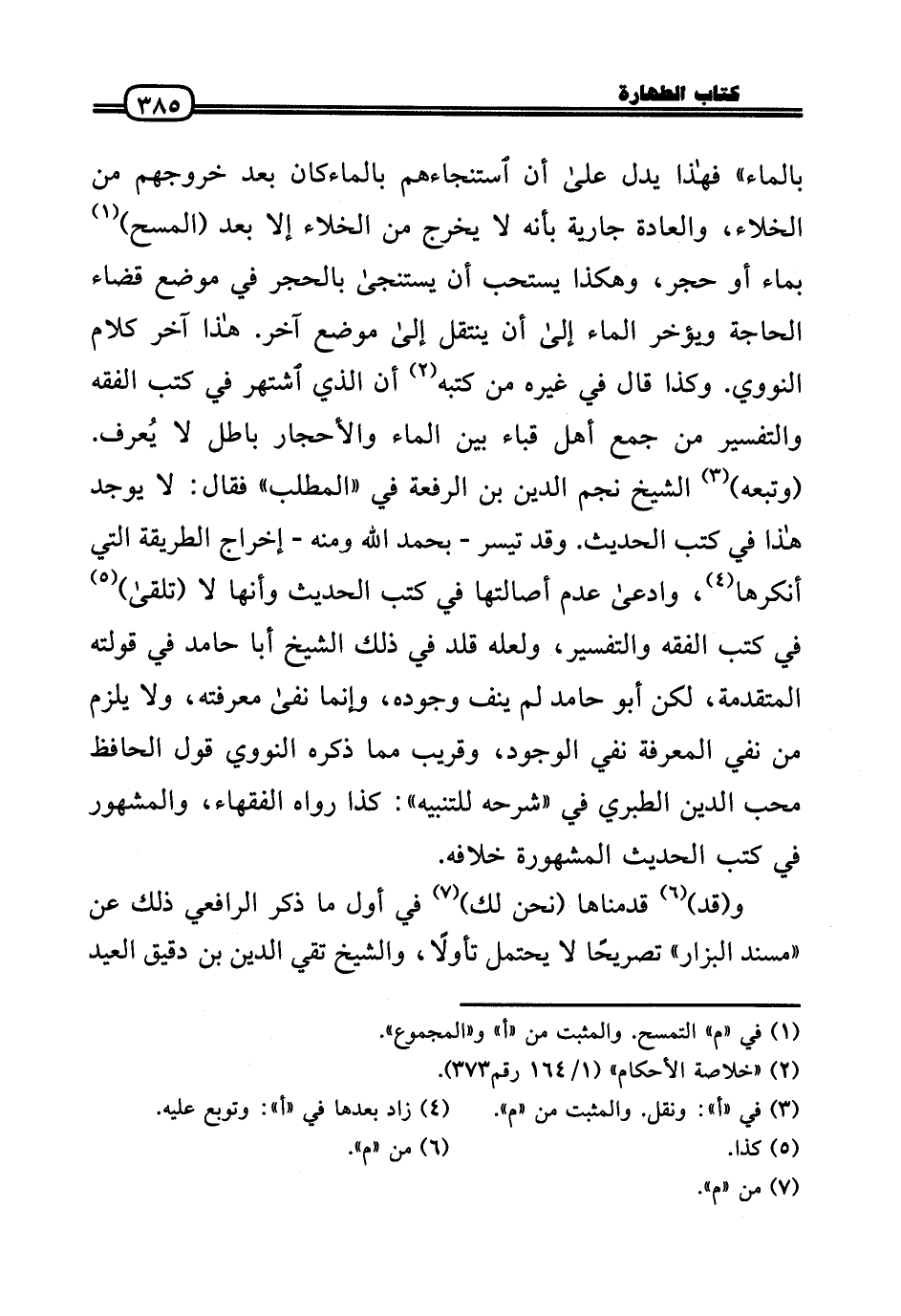 بِالْمَاءِ» فَهَذَا يدل عَلَى أَن استنجاءهم بالماءكان بعد خُرُوجهمْ من الْخَلَاء، وَالْعَادَة جَارِيَة بِأَنَّهُ لَا يخرج من الْخَلَاء إِلَّا بعد (الْمسْح) بِمَاء أَو حجر، وَهَكَذَا يسْتَحبّ أَن يستنجى بِالْحجرِ فِي مَوضِع قَضَاء الْحَاجة وَيُؤَخر المَاء إِلَى أَن ينْتَقل إِلَى مَوضِع آخر. هَذَا آخر كَلَام النَّوَوِيّ. وَكَذَا قَالَ فِي غَيره من كتبه أَن الَّذِي اشْتهر فِي كتب الْفِقْه وَالتَّفْسِير من جمع أهل قبَاء بَين المَاء والأحجار بَاطِل لَا يُعرف. (وَتَبعهُ) الشَّيْخ نجم الدَّين بن الرّفْعَة فِي «الْمطلب» فَقَالَ: لَا يُوجد هَذَا فِي كتب الحَدِيث. وَقد تيَسّر - بِحَمْد الله وَمِنْه - إِخْرَاج الطَّرِيقَة الَّتِي أنكرها، وَادَّعَى عدم أصالتها فِي كتب الحَدِيث وَأَنَّهَا لَا (تلقى) فِي كتب الْفِقْه وَالتَّفْسِير، وَلَعَلَّه قلد فِي ذَلِك الشَّيْخ أَبَا حَامِد فِي قولته الْمُتَقَدّمَة، لَكِن أَبُو حَامِد لم ينف وجوده، وَإِنَّمَا نَفَى مَعْرفَته، وَلَا يلْزم من نفي الْمعرفَة نفي الْوُجُود، وَقَرِيب مِمَّا ذكره النَّوَوِيّ قَول الْحَافِظ محب الدَّين الطَّبَرِيّ فِي «شَرحه للتّنْبِيه» : كَذَا رَوَاهُ الْفُقَهَاء، وَالْمَشْهُور فِي كتب الحَدِيث الْمَشْهُورَة خِلَافه.