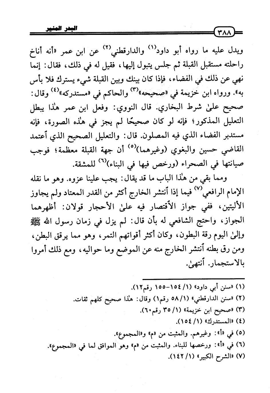 وَيدل عَلَيْهِ مَا رَوَاهُ أَبُو دَاوُد وَالدَّارَقُطْنِيّ عَن ابْن عمر «أَنه أَنَاخَ رَاحِلَته مُسْتَقْبل الْقبْلَة ثمَّ جلس يتبول إِلَيْهَا، فَقيل لَهُ فِي ذَلِك، فَقَالَ: إِنَّمَا نهي عَن ذَلِك فِي الفضاء، فَإِذا كَانَ بَيْنك وَبَين الْقبْلَة شَيْء يسترك فَلَا بَأْس بِهِ» . وَرَوَاهُ ابْن خُزَيْمَة فِي «صَحِيحه» وَالْحَاكِم فِي «مُسْتَدْركه» وَقَالَ: صَحِيح عَلَى شَرط البُخَارِيّ. قَالَ النَّوَوِيّ: وَفعل ابْن عمر هَذَا يبطل التَّعْلِيل الْمَذْكُور؛ فَإِنَّهُ لَو كَانَ صَحِيحا لم يجز فِي هَذِه الصُّورَة، فَإِنَّهُ مستدبر الفضاء الَّذِي فِيهِ المصلون. قَالَ: وَالتَّعْلِيل الصَّحِيح الَّذِي اعْتمد القَاضِي حُسَيْن وَالْبَغوِيّ (وَغَيرهمَا) أَن جِهَة الْقبْلَة معظمة؛ فَوَجَبَ صيانتها فِي الصَّحرَاء (وَرخّص فِيهَا فِي الْبناء) للْمَشَقَّة.