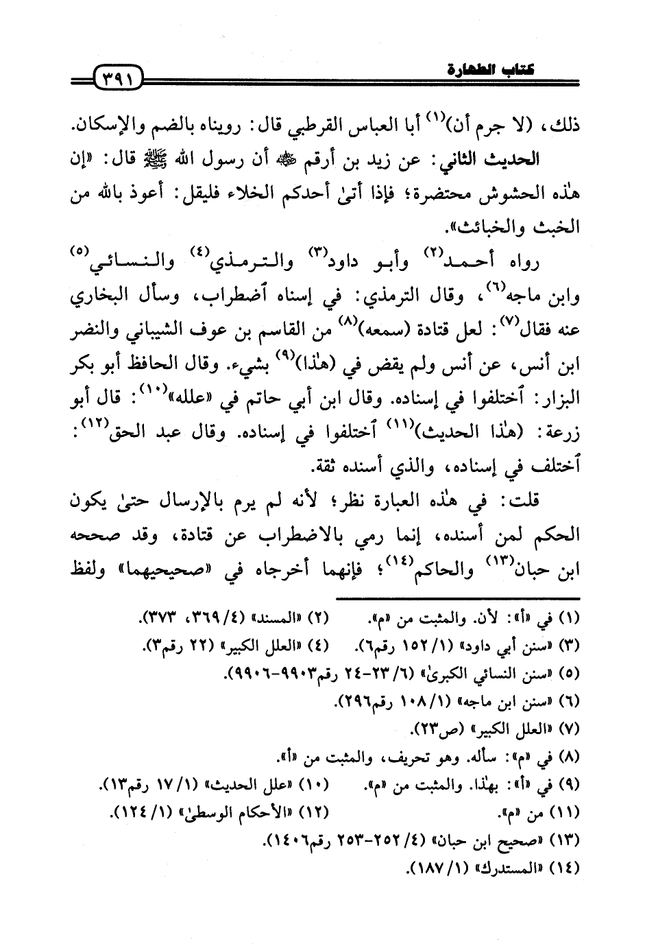 الحَدِيث الثَّانِي: عَن زيد بن أَرقم رَضي اللهُ عَنهُ أَن رَسُول الله - صَلَّى الله عَلَيْهِ وَسلم - قَالَ: «إِن هَذِه الحشوش محتضرة؛ فَإِذا أَتَى أحدكُم الْخَلَاء فَلْيقل: أعوذ بِاللَّه من الْخبث والخبائث» .