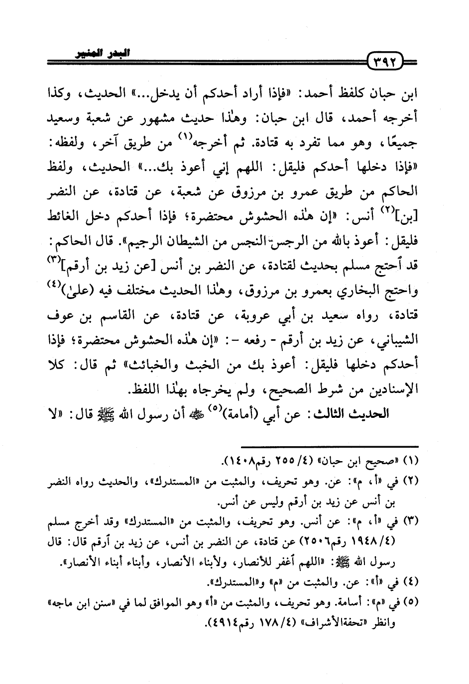 ابْن حبَان كَلَفْظِ أَحْمد: «فَإِذا أَرَادَ أحدكُم أَن يدْخل ... » الحَدِيث، وَكَذَا أخرجه أَحْمد، قَالَ ابْن حبَان: وَهَذَا حَدِيث مَشْهُور عَن شُعْبَة وَسَعِيد جَمِيعًا، وَهُوَ مِمَّا تفرد بِهِ قَتَادَة. ثمَّ أخرجه من طَرِيق آخر، وَلَفظه: «فَإِذا دَخلهَا أحدكُم فَلْيقل: اللَّهُمَّ إِنِّي أعوذ بك ... » الحَدِيث، وَلَفظ الْحَاكِم من طَرِيق عَمْرو بن مَرْزُوق عَن شُعْبَة، عَن قَتَادَة، عَن النَّضر [بن] أنس: «إِن هَذِه الحشوش محتضرة؛ فَإِذا أحدكُم دخل الْغَائِط فَلْيقل: أعوذ بِاللَّه من الرجس النَّجس من الشَّيْطَان الرَّجِيم» . قَالَ الْحَاكِم: قد احْتج مُسلم بِحَدِيث لِقَتَادَة، عَن النَّضر بن أنس [عَن زيد بن أَرقم] وَاحْتج البُخَارِيّ بِعَمْرو بن مَرْزُوق، وَهَذَا الحَدِيث مُخْتَلف فِيهِ (عَلَى) قَتَادَة، رَوَاهُ سعيد بن أبي عرُوبَة، عَن قَتَادَة، عَن الْقَاسِم بن عَوْف الشَّيْبَانِيّ، عَن زيد بن أَرقم - رَفعه -: «إِن هَذِه الحشوش محتضرة؛ فَإِذا أحدكُم دَخلهَا فَلْيقل: أعوذ بك من الْخبث والخبائث» ثمَّ قَالَ: كلا الإسنادين من شَرط الصَّحِيح، وَلم يخرجَاهُ بِهَذَا اللَّفْظ.