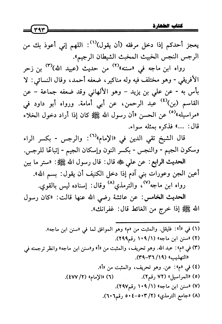 الحَدِيث الْخَامِس: عَن عَائِشَة رَضي اللهُ عَنها قَالَت: «كَانَ رَسُول الله - صَلَّى الله عَلَيْهِ وَسلم - إِذا خرج من الْغَائِط قَالَ: غفرانك» .
