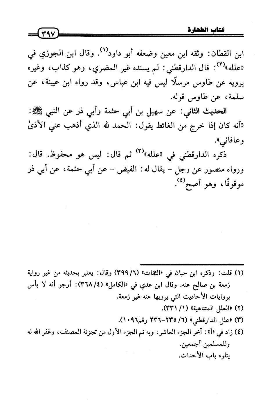 الحَدِيث الثَّانِي: عَن سُهَيْل بن أبي حثْمَة وَأبي ذَر عَن النَّبِي - صَلَّى الله عَلَيْهِ وَسلم -: «أَنه كَانَ إِذا خرج من الْغَائِط يَقُول: الْحَمد لله الَّذِي أذهب عني الْأَذَى وعافاني» .