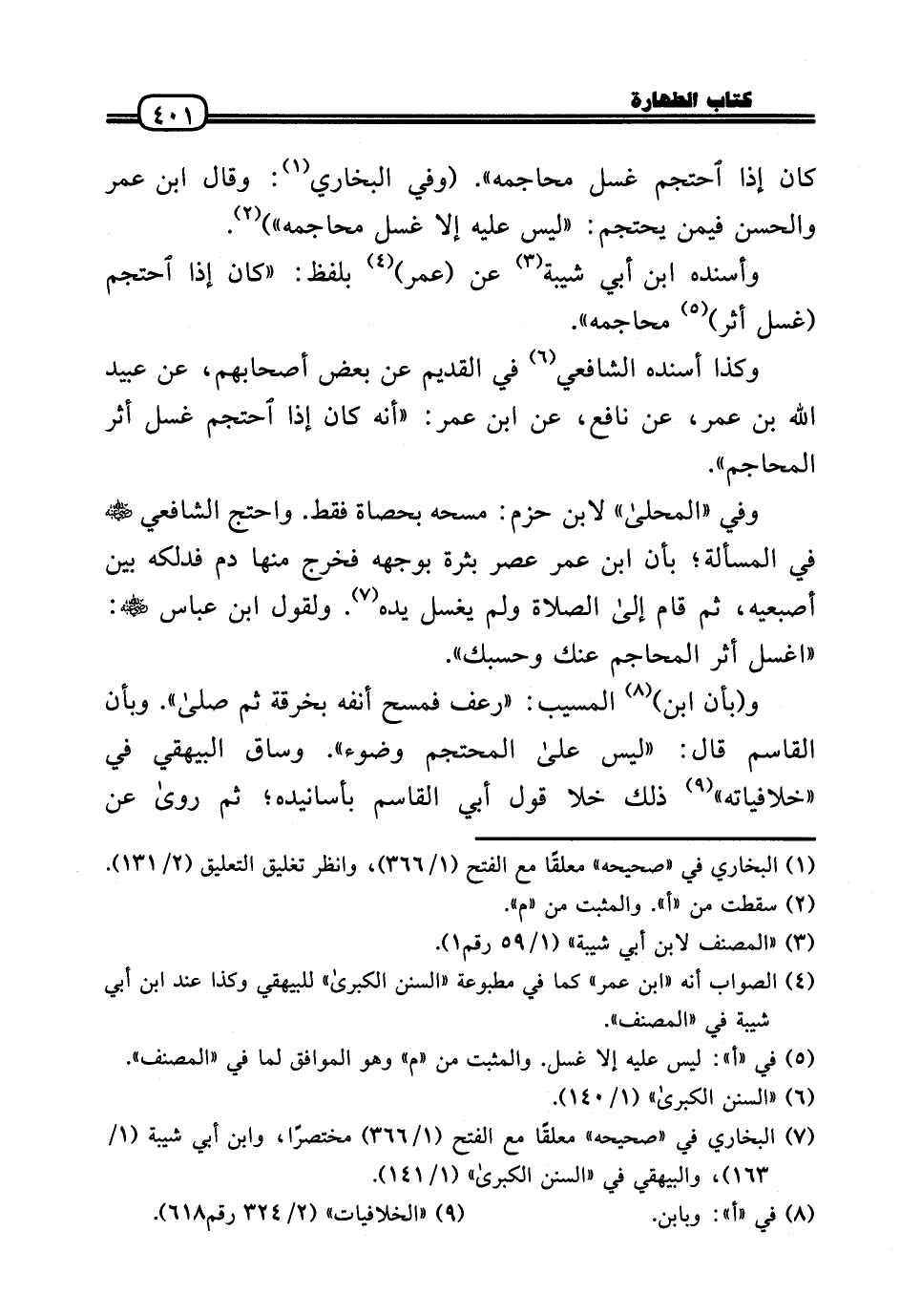 كَانَ إِذا احْتجم غسل محاجمه» . (وَفِي البُخَارِيّ: وَقَالَ ابْن عمر وَالْحسن فِيمَن يحتجم: «لَيْسَ عَلَيْهِ إِلَّا غسل محاجمه» ) .